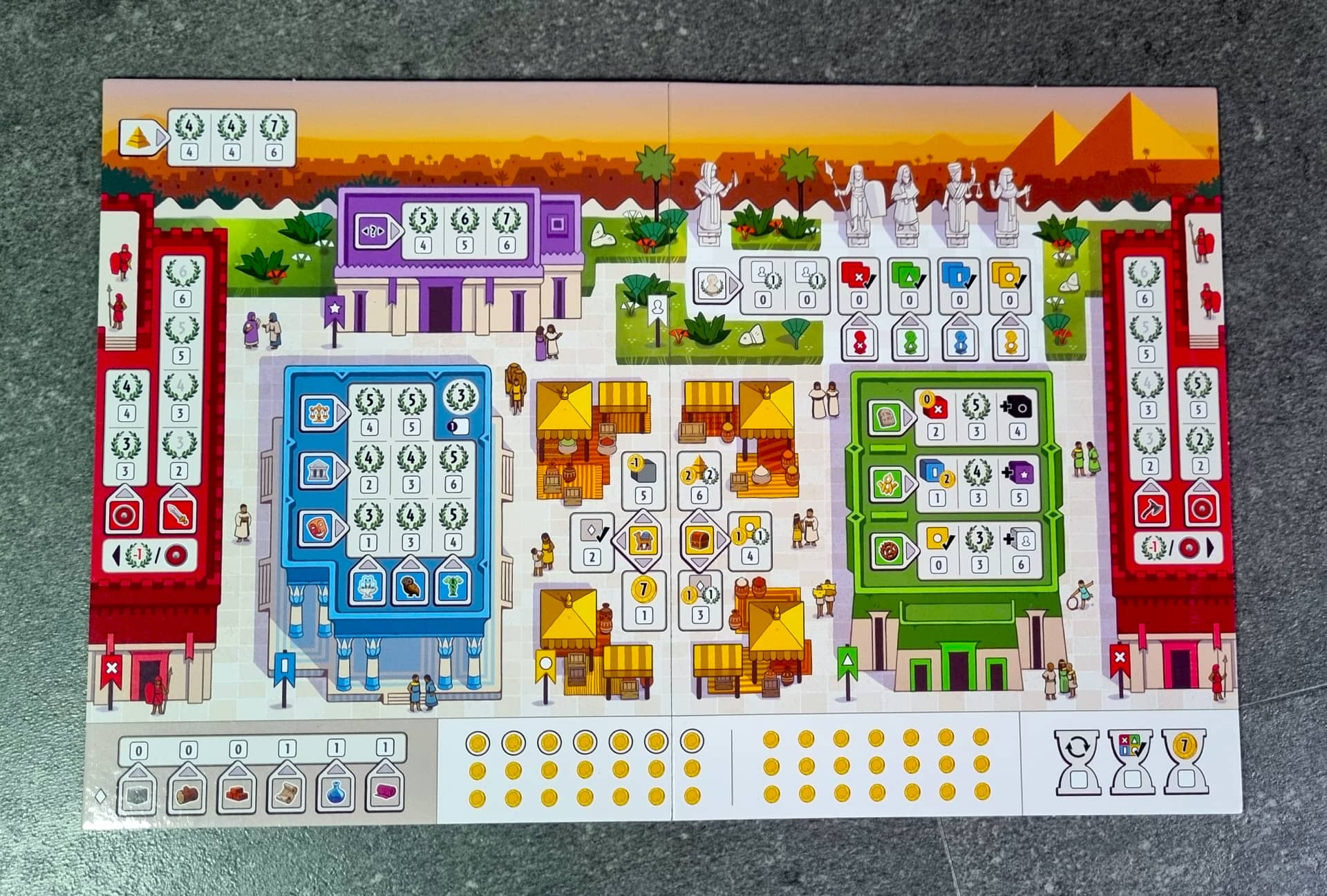 I v této hře potřebujete ke stavbě budov suroviny a jak jste zvyklí, suroviny se nespotřebovávají. Zde není důležité, jaké produkujete, ale kolik různých typů produkujete. Každá z budov potřebuje pro stavbu určitý počet surovin. Nejdražší budovy vás budou stát šest různých surovin. To je maximum, které můžete ve svém městě produkovat. Pokud neprodukujete dostatečné množství surovin, můžete doplatit rozdíl pomocí mincí. Další akcí je stavba části divu nebo ukončení tahu a zisk tří mincí.