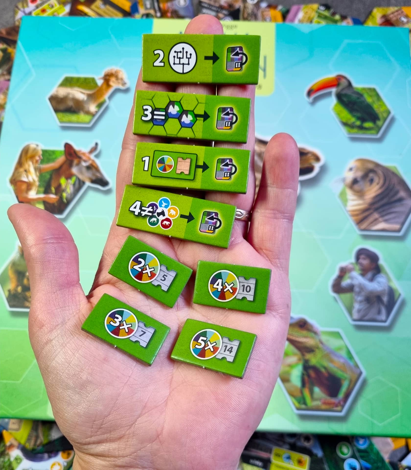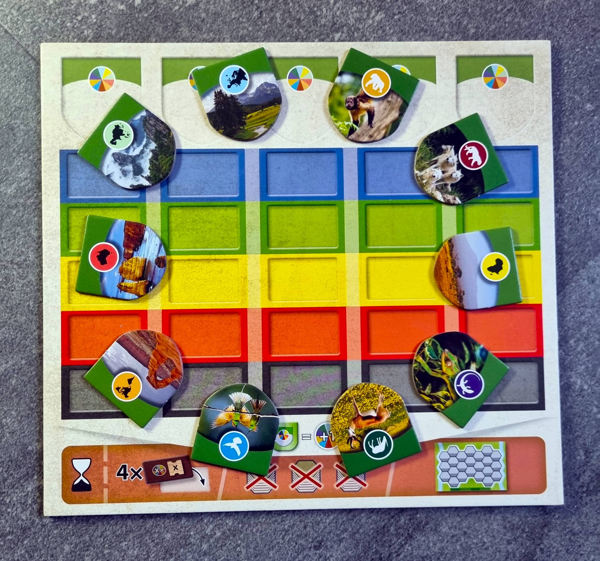 V neposlední řadě získáte slušnou nálož bodů prostřednictvím ochranářských úkolů. Ty do hry také přináší značnou porci variability. V krabici jich je k dispozici celkem deset a na každou partii jich využijete pět náhodně vylosovaných. Ikonografie je přehledná a bodování vám rychle přejde do krve. Pokud jste zvládli spočítat body ve hře Útočiště nebo Smíšený les, bude to pro vás hračka.