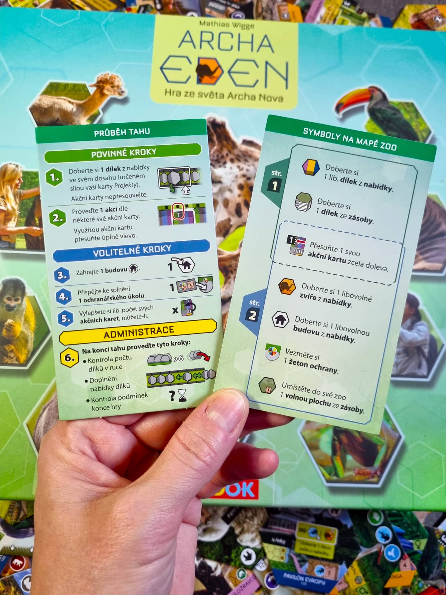 Archa Eden (v originále Sanctuary) je hrou pro 1–4 hráče od 12 let. Nebála bych se u vyhranějších dětí tuto hranici snížit klidně i na 10 let. Ve hře převezmete pod svou správu zoologickou zahradu a snažíte se, aby prosperovala a byla tou nejúspěšnější ZOO vůbec. V tomhle směru je to stejné jako u původní hry Archa Nova, ze které Archa Eden vychází. U tohoto titulu se autor Mathias Wigge snažil svou původní veleúspěšnou hru zjednodušit a zpřístupnit širšímu publiku. A tento záměr se mu povedl. Zachoval původní téma a v jednodušší podobě i základní herní mechaniky. A opravdu citelně zkrátil herní dobu. První partie s jedenáctiletou dcerou jen ve dvou nám trvala něco málo přes hodinu. Včetně vysvětlení pravidel a spočítání bodů.