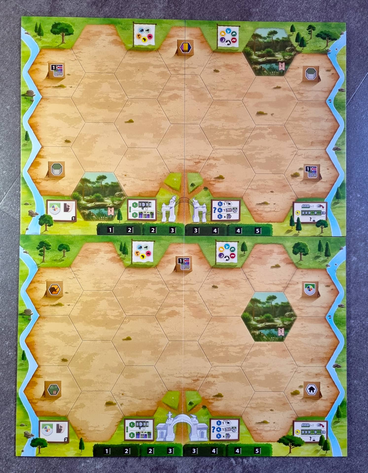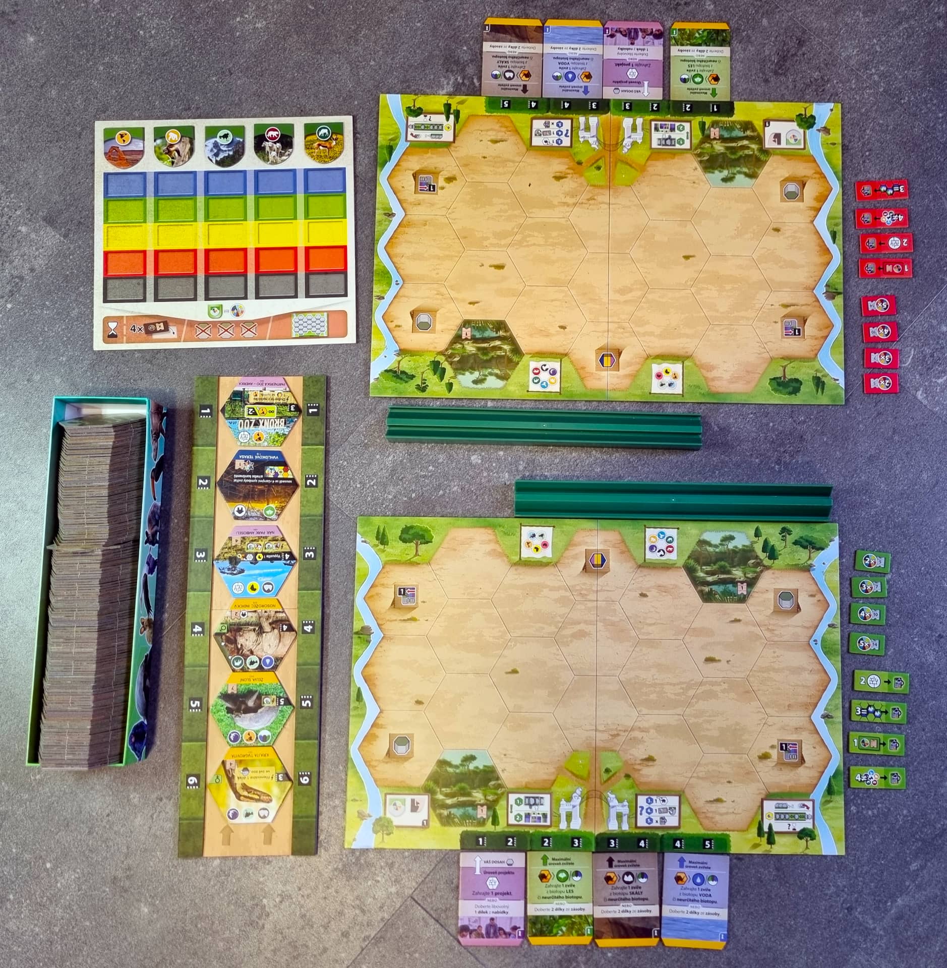 Každý hráč má svoji desku ZOO, kterou postupně zaplňuje hexovými dílky zvířat, budov a projektů. Archa Eden má zde oproti své starší sestře znatelné zlepšení. Desky jsou, stejně jako dílky, z pevného kartonu. Dílky jsou velké a obsahují veškeré informace, které pro jejich vyložení i bodování potřebujete znát.