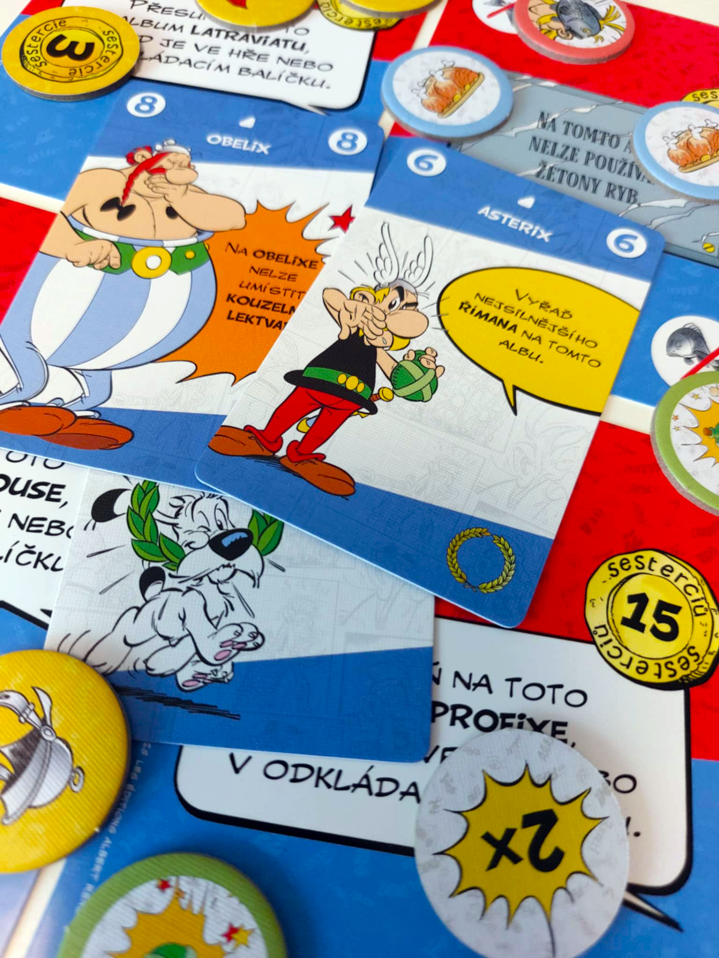 Systém vykládání karet je překvapivě taktický a vyžaduje neustálou pozornost, protože nemůžete jen tak plácnout libovolnou kartu, kam se vám zachce. Každé album ležící na stole má striktně danou orientaci. Červená strana představuje římskou frakci a modrá strana patří nezdolným Galům. Pokud tedy držíte v ruce kartu Gala, jako je Asterix nebo Obelix, musíte ji vyložit výhradně k modré hraně alba, zatímco římští legionáři a centurioni, včetně samotného Caesara, musí být umístěni k červené straně. Do toho vstupují fialové neutrální postavy (ať žije Kalamaikamikmikmix), které tento systém narušují a mohou být vyloženy k oběma stranám, což z nich činí flexibilní žolíky pro krizové situace. Musíte tak neustále sledovat nejen sílu svých karet, ale i jejich barvu, abyste se nezablokovali v momentě, kdy potřebujete nutně bodovat.