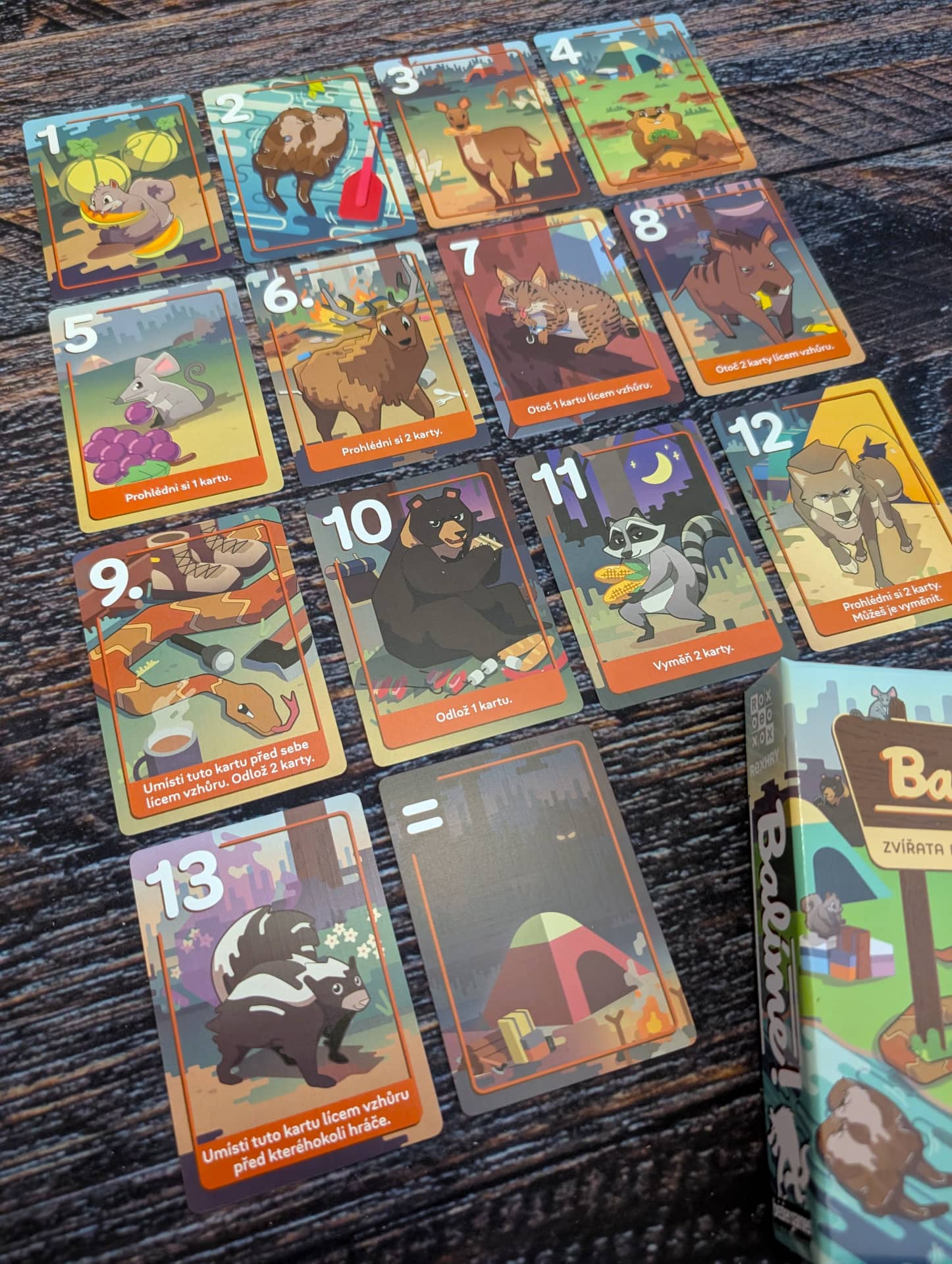 A pak už to začíná. Myš vám umožní prohlédnout si jednu kartu u sebe, parťáka nebo soupeře. Díky sobovi můžete prohlédnout karty dokonce 2. Rys vám dovolí otočit jednu kartu lícem vzhůru a celému světu tím sdělit, co na ní je. Divočák otočí dokonce dvě karty. Hada při zahrání neodložíte, ale umístíte před sebe a odložíte dvě jiné karty (klidně u spoluhráče). Medvěd vám umožní odložit jednu kartu, vychytralý mýval dvě karty vyměnit. Díky vlkům si můžete nejdříve dvě karty prohlédnout a poté je klidně vyměnit. Posledního skunka také neodložíte, ale namísto toho jej dáte lícem vzhůru před kteréhokoliv hráče.
