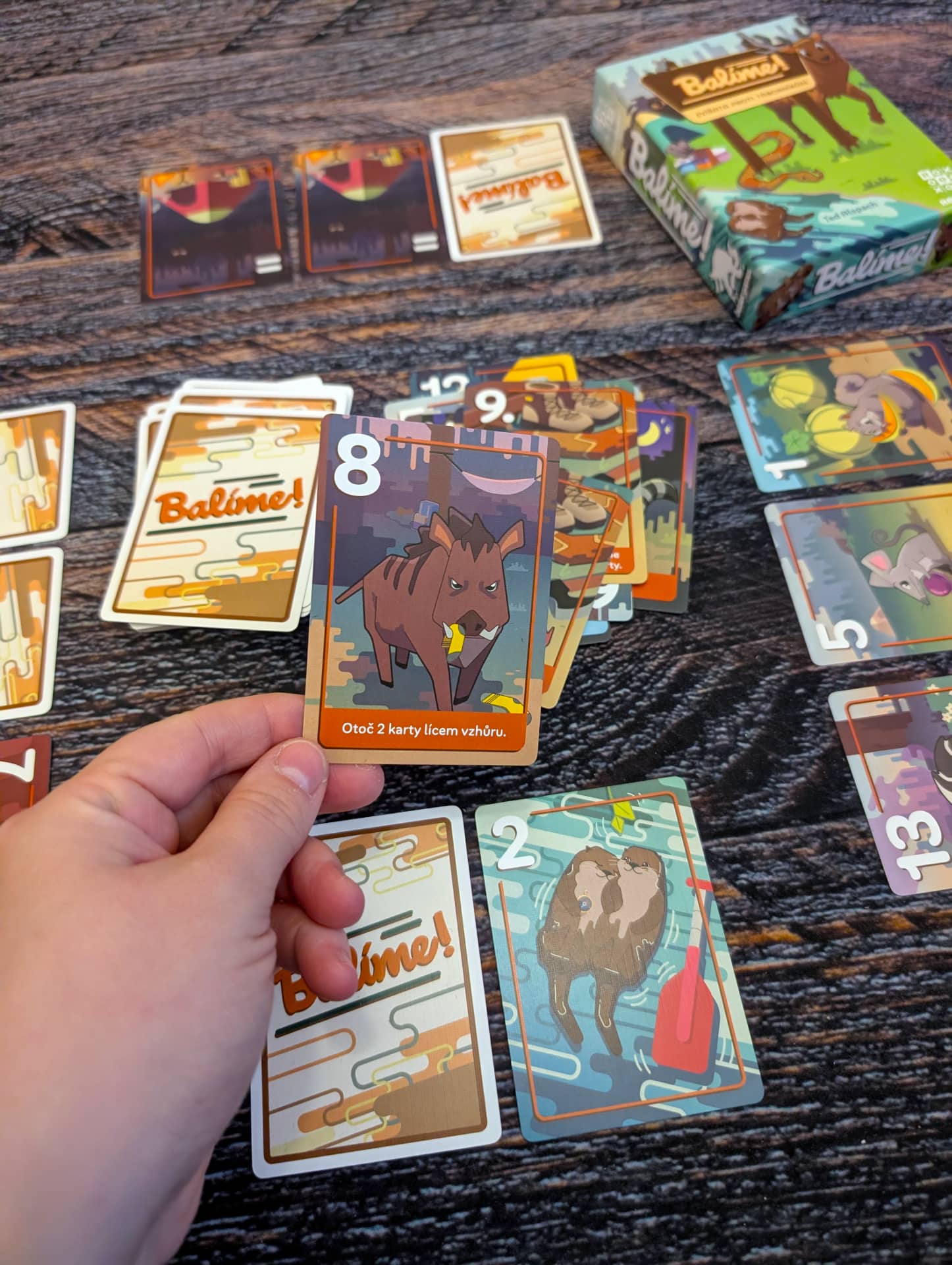 Balíme! je pro mě zábavnější než ostatní hry tohoto typu také proto, že drtivá většina karet má na sobě nějakou schopnost, a vy tak máte mnoho příležitostí zvrátit hru. Ve hře najdete celkem třináct možných hodnot karet (a k tomu „rovná se“). Jediné karty, které žádnou schopnost neobsahují, jsou ty o hodnotách 1–4. U těch se tak nějak předpokládá, že byste stejně jejich schopnost nehráli, protože byste s nimi chtěli nahradit nějakou vyšší kartu před sebou.