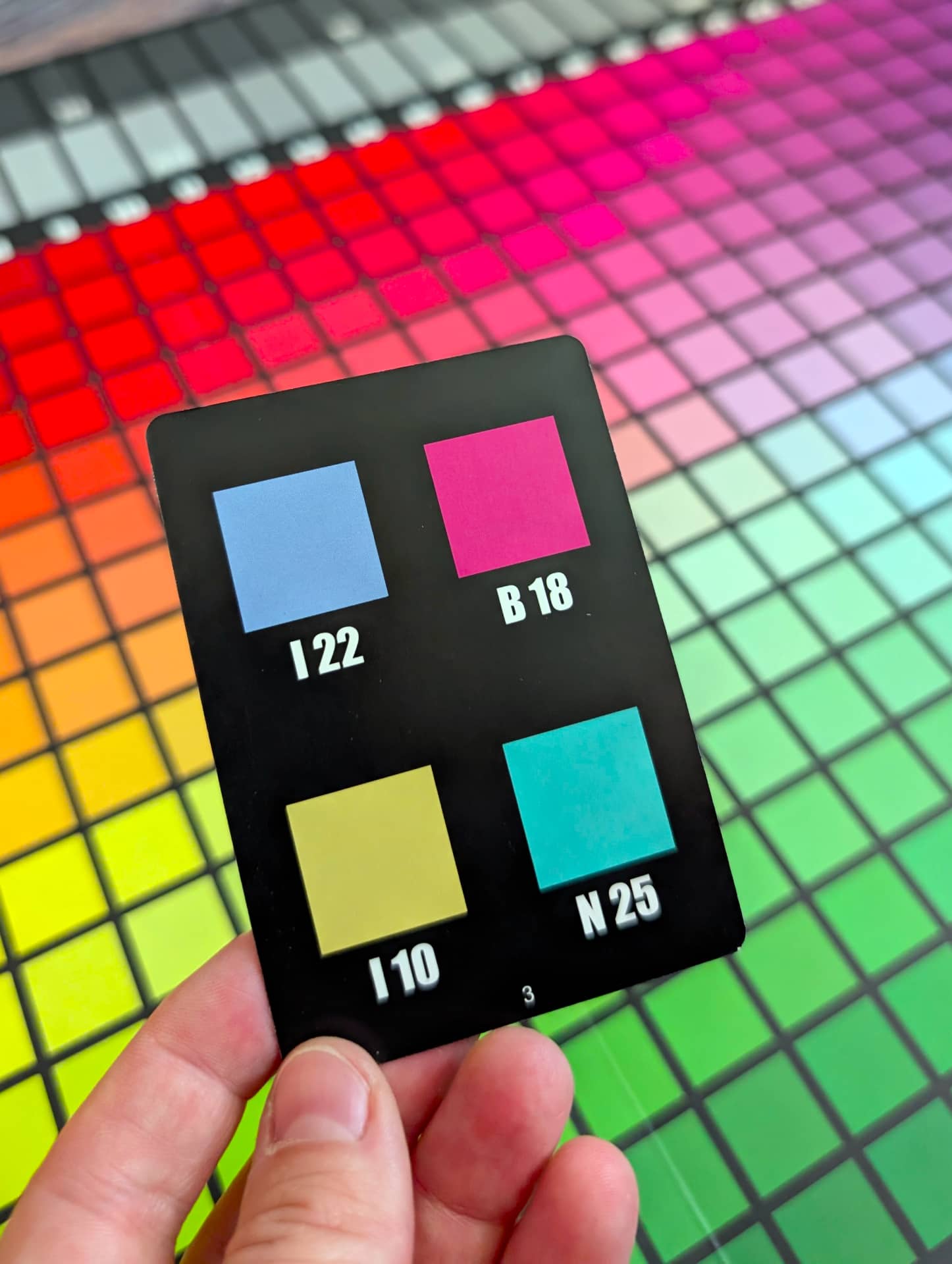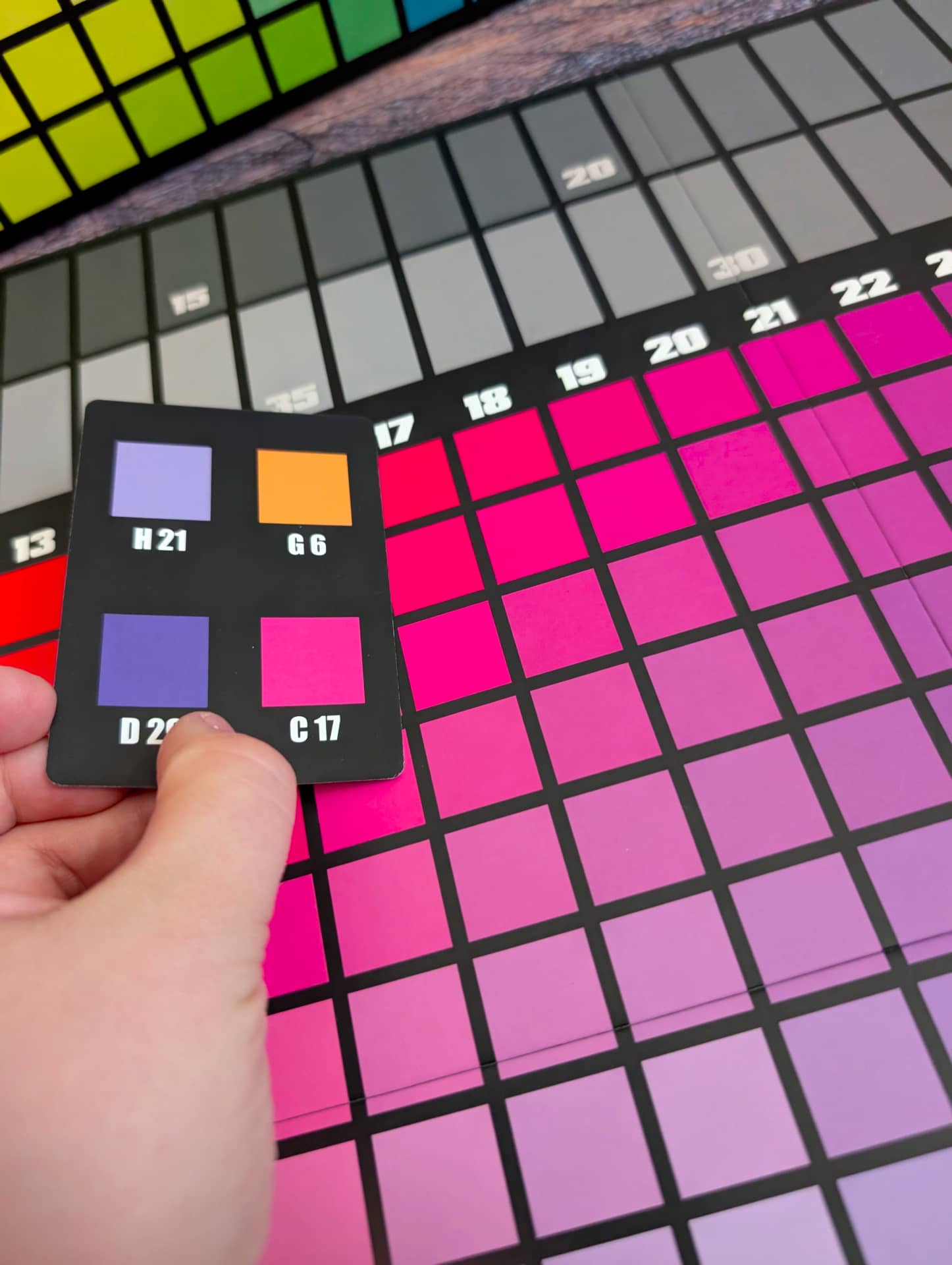 Je to tak, herně jsem ze hry nadšená a slaví úspěch s každým, na koho ji vytáhnu. Má ale pro mě velký problém, který v konečném důsledku snižuje moje hodnocení a vlastně i zážitek z hraní. Nevím, zda je to problém jen mojí kopie nebo celého českého, či snad celosvětového tisku, ale… barvy na kartách neodpovídají barvám na herní desce. Vlastně téměř na žádné kartě, ale asi nejhůř to jde vidět na kartě s B2, která odpovídá na desce poli B1 (blízko, ale rozdíl pro bodování to je) a především kartě E29, která je prostě špatně. Na kartě je barva fialová, přibližně vypadá jako pole na desce B30, a to už je prostě moc daleko od té tmavě modré, která to měla být správně.