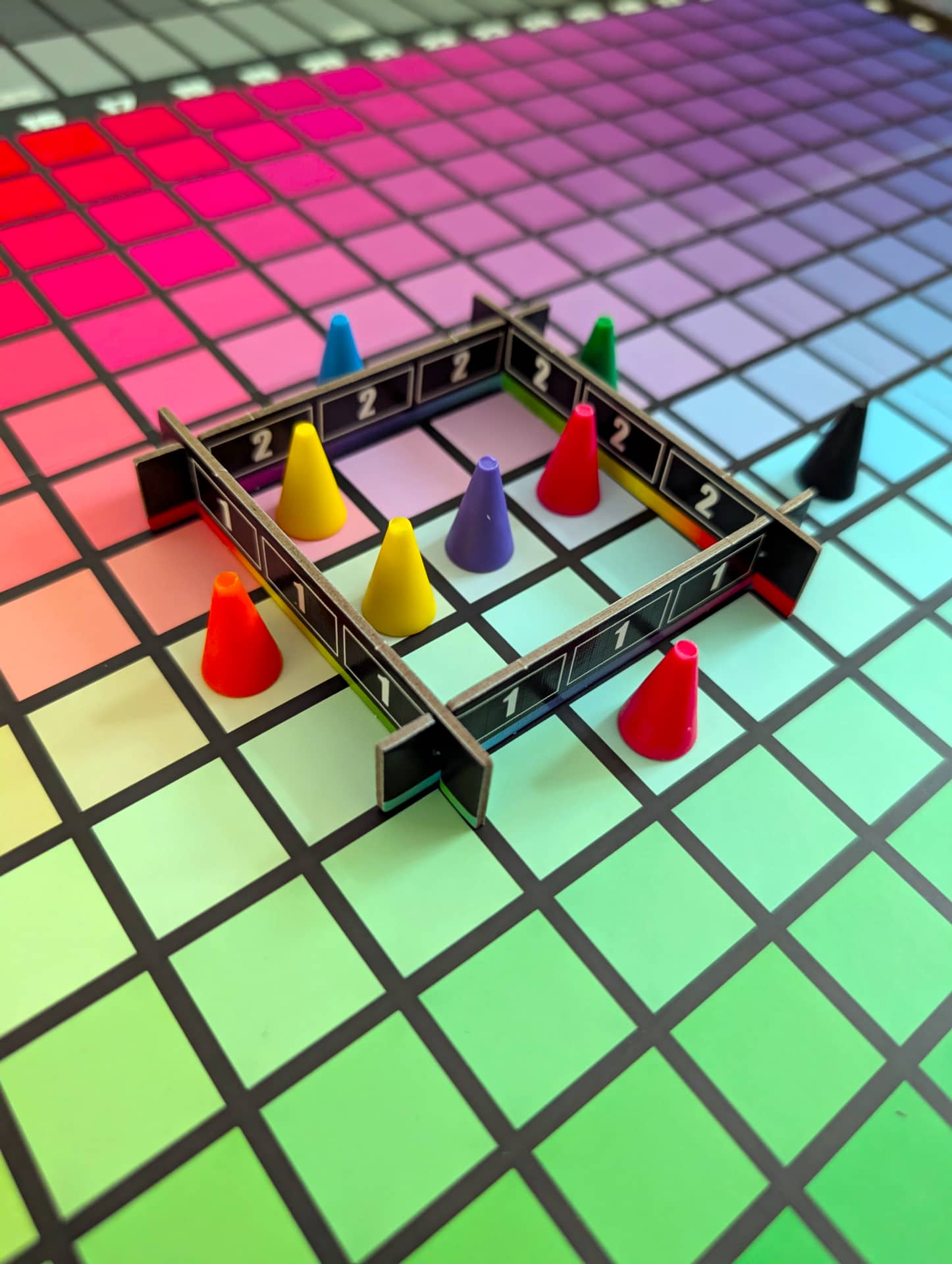 Za co vlastně budete během partie sbírat body? Napovídač získává bod za každý ukazatel, který je buď přímo na zvolené barvě, nebo se jí dotýká (i diagonálně, celkem tedy máte devět polí, na která se vám hodí, když soupeři umístí své ukazatele).