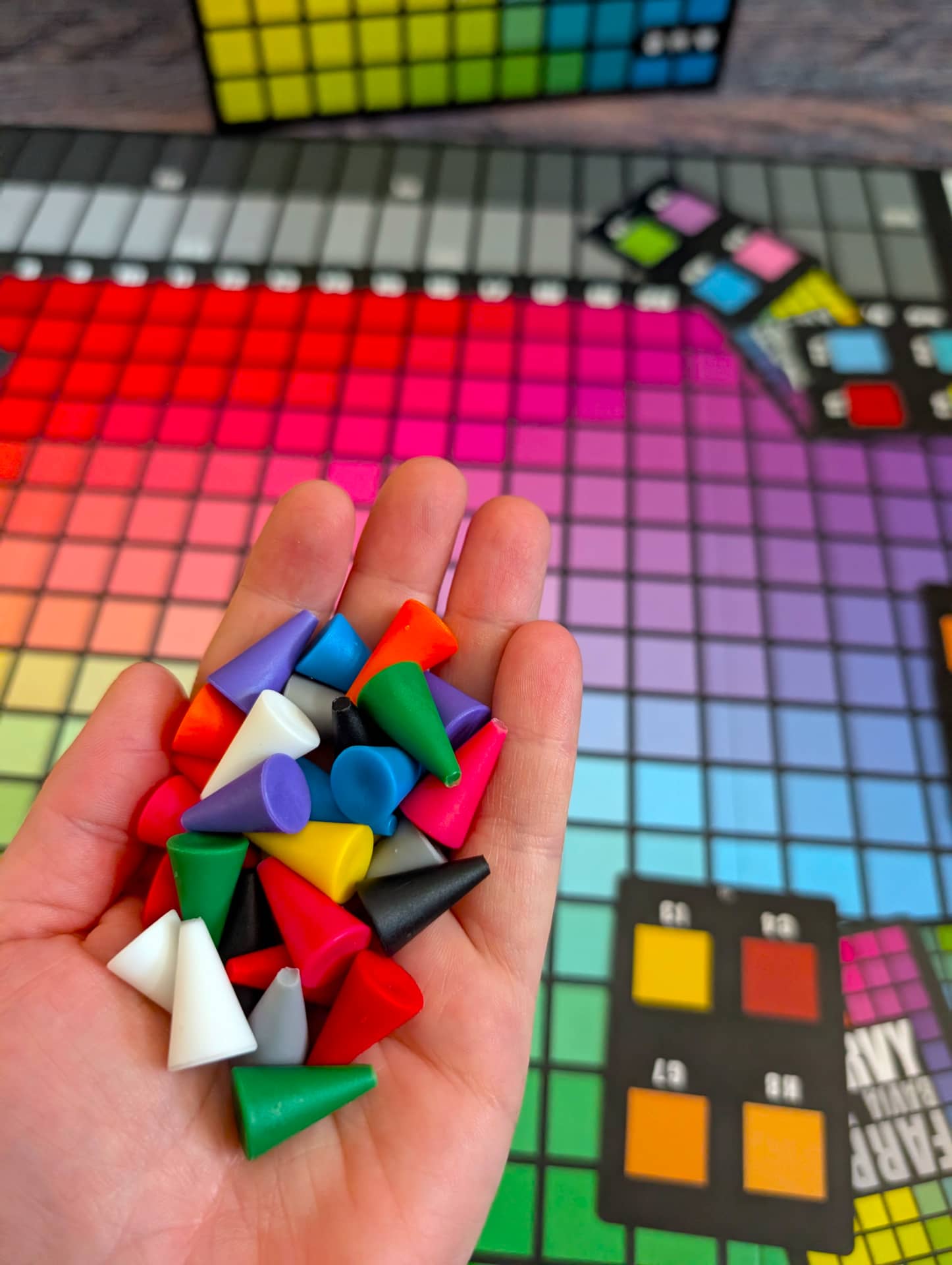 Při první partii nás tento produkční nedostatek dost překvapil, když moji perfektní nápovědu „čerstvý bobek“ jeden soupeř určil správně jako B2, ale ta barva na kartě, na kterou jsem se dívala, byla prostě B1, což zvolil jiný soupeř. Řeknete si, o nic nejde, rozdíl jednoho bodu… jenže u hry, která je o barvách, bych čekala, že ty barvy budou prostě odpovídat. Takto musíme koukat vždy ne na kartu, ale na společnou desku a všímaví soupeři pak celkem jasně vidí, kterým směrem se koukáte. Když poté dáte nápovědu „růže“, ti, kdo na vás koukali, přesně ví, že mají mířit k růžové, kdežto většina lidí by skrze růži zvolila spíše červenou.