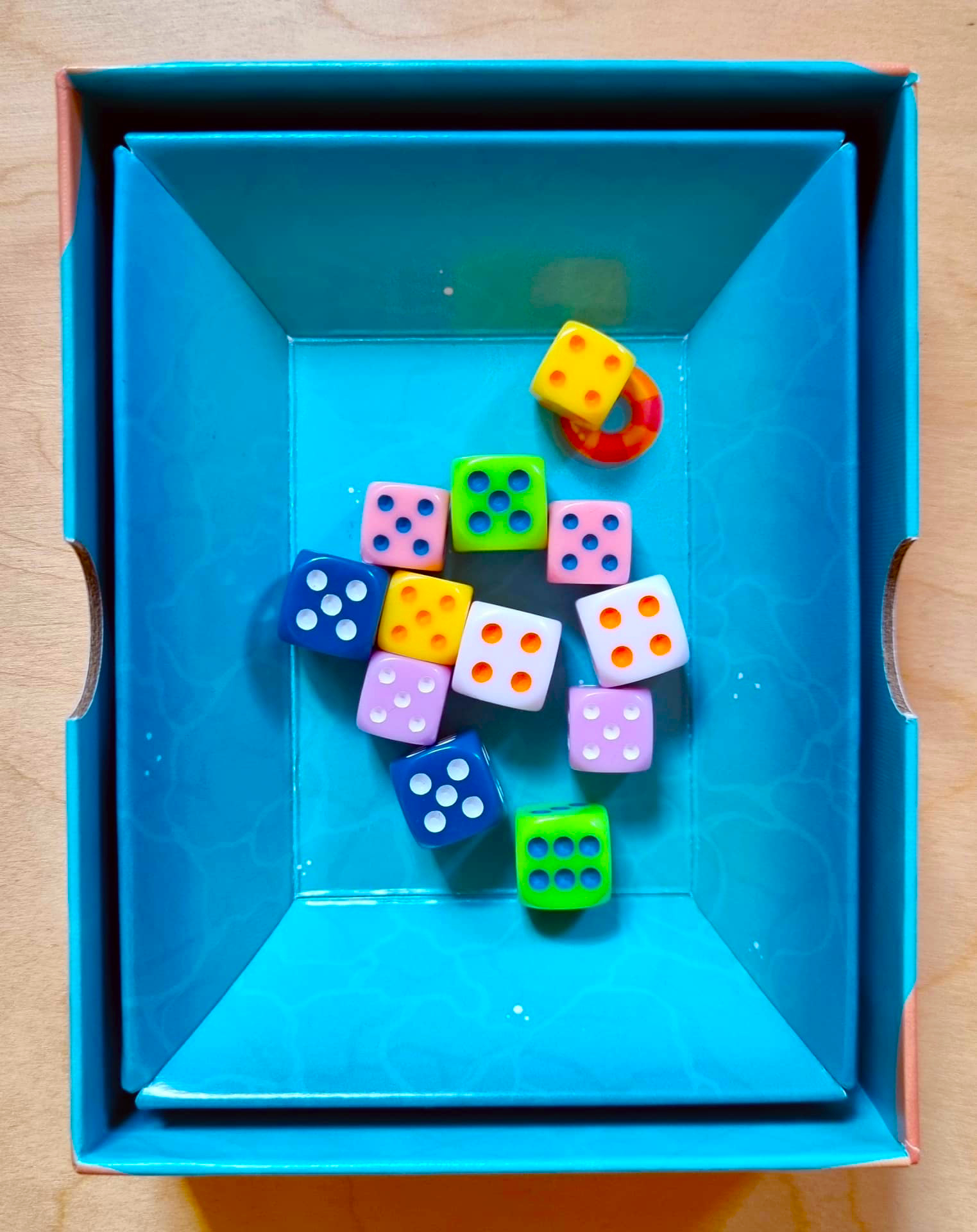 Z popisu může člověka napadnout, proč si vůbec něco takového má pořizovat. Stačí koupit šest párů barevných kostek a vymyslet si nějaké bodovací kategorie. A jistě to je cesta. Bazén plný kostek si ale rozhodně své místo najde. Zpracování si totiž opravdu zaslouží pochvalu. Já vím, taková blbina, ale ta krabička je opravdu bazén! A kruh ve tvaru jednorožce na přebalu je velké hlasité ANO hlavně u dětí.