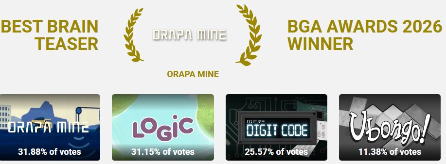 V kategorii mozkovarů zvítězila s velmi těsným rozdílem hra Orapa Mine, česky známá jako Hledači drahokamů. Tento abstraktní titul inspirovaný těžbou diamantů v Botswaně jsou staré, dobré „lodě“ na steroidech. Je to titul, který odměňuje prostorovou představivost a schopnost vidět několik tahů dopředu. Na svou mřížku umístíte různě barevné a tvarované drahokamy a pak na soupeře vysíláte na dané souřadnice laserový paprsek. A ten se na základě odrazů vrací ven v určité barvě. Takže tu kombinujete, jak se paprsek mohl odrážet, do jakého dalšího drahokamu mohl narazit a dedukujete, kde který drahokam soupeř ukrývá. Hra je to svižná na BGA i na stole a vydavatelství Old Dawg nám ji přineslo v češtině.
