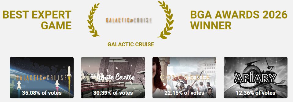 V kategorii těžkých hardcore her si zlato odnáší Galactic Cruise. Tento komplexní euro titul vás postaví do role manažerů vesmírné cestovní kanceláře, ve které musíte stavět rakety, plánovat itineráře, uspokojovat cestující a zároveň rozvíjet své technologie. Hra i ve fyzické podobě vyšla v roce 2025 a připravte se na poměrně náročnou záležitost s vysokou komplexitou i herním časem. Hra se dá hrát sólo a na BGA už je připravený i tutoriál, který vám umožní snáze proniknout do tajů vedení luxusní mezihvězdné cestovky. Česká lokalizace zatím oznámena nebyla.