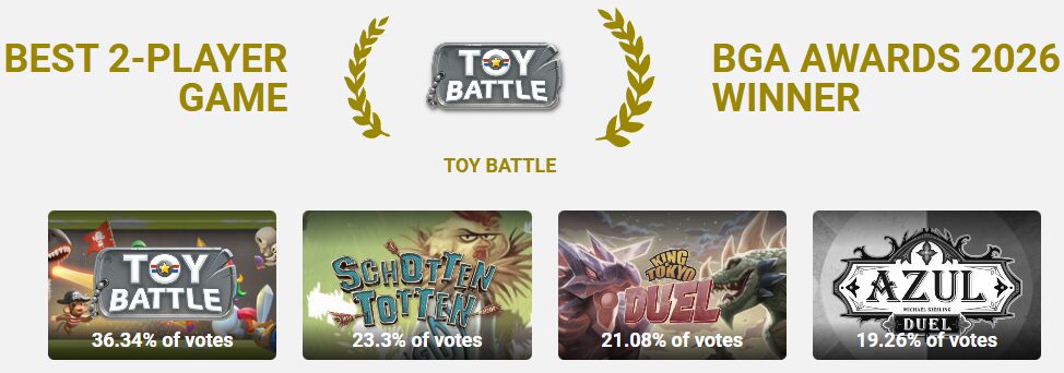 V kategorii duelovek letos dominoval Souboj hraček. A kromě kategorie pro dva hráče navíc hra vyhrála i zvláštní ocenění – nejlepší hra týmu Board Game Arena. Tento vizuálně hravý, ale takticky nečekaně hluboký titul sází na asymetrické schopnosti různých hrdinů z dětského pokoje a různé mapy a terény, které každý souboj skutečně změní. Na BGA se stal hitem především díky své přímočarosti a rychlému tempu, kdy se každé rozhodnutí o nasazení bojové kačenky nebo plastového vojáčka počítá. Titul je to svižný a zábavný a díky vydavatelství asmodee si jej opět můžete dopřát i na stole.