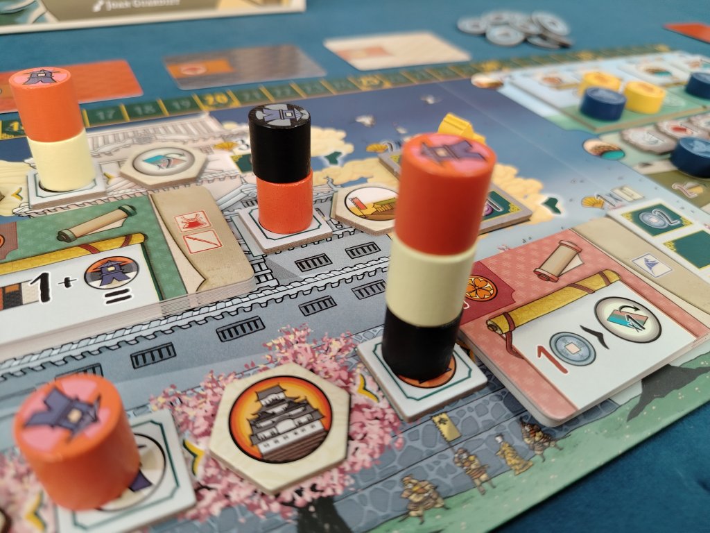 Provádění akcí vám bude povědomé, pokud máte zkušenosti s hrou Bílý hrad. U dvořanů postupujete na stupnici společenského žebříčku přímo na hradě Himedži a tento postup vás bude stát perleť. Na zahrady umisťujete za jídlo pečeti svého klanu, získáte zobrazený bonus a na závěr hry symbol pro závěrečné bodování. Umístění pečetě na cvičiště vás stojí železo, získáte zobrazený bonus a na konci hry počet pečetí násobíte symboly meče a přilby, které jste získali během hry. Při obchodování si za libovolné zdroje nakupujete karty vlivu a běžné nebo luxusní zboží. Karty i žetony zboží vám poskytují symboly pro závěrečné bodování.