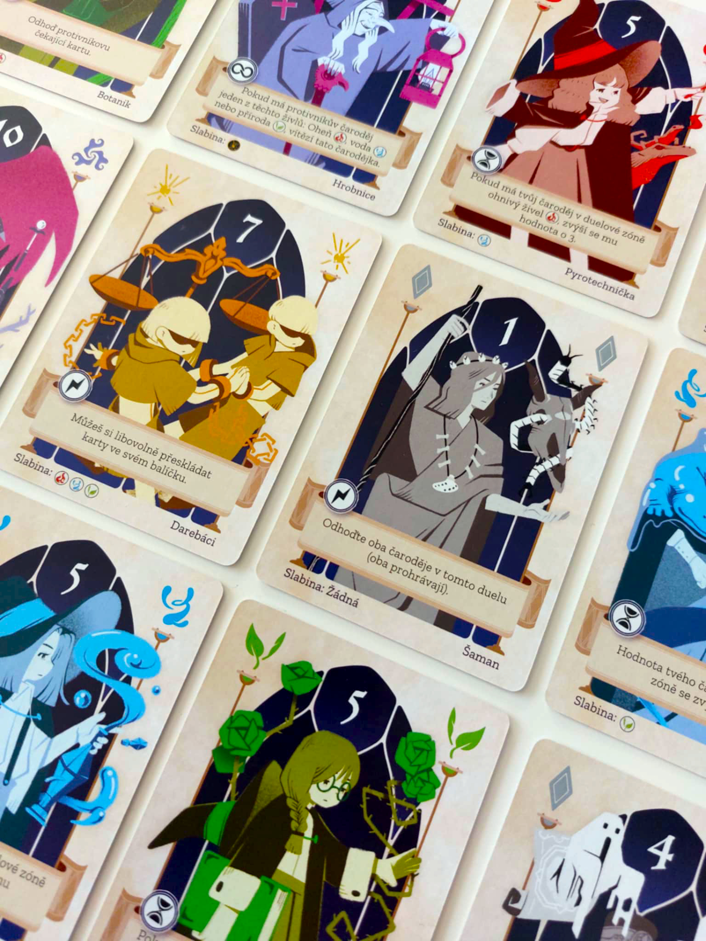 Ilustrace od umělce jménem yamamori vdechují každému z čarodějů jedinečný charakter a osobitost pomocí moderního, stylizovaného a lehce anime nádechu. Výrazné barevné palety jasně odlišují jednotlivé živly, což napomáhá okamžité orientaci v probíhajícím duelu. Samotný grafický design karet je pak příkladem skvělé přehlednosti a intuitivnosti. Všechny klíčové informace, od číselné hodnoty, symbolu živlu až po ikonu typu schopnosti i text samotné magické dovednosti, mají své pevně dané místo, díky čemuž se hráči mohou rychle zorientovat a soustředit se na taktiku.