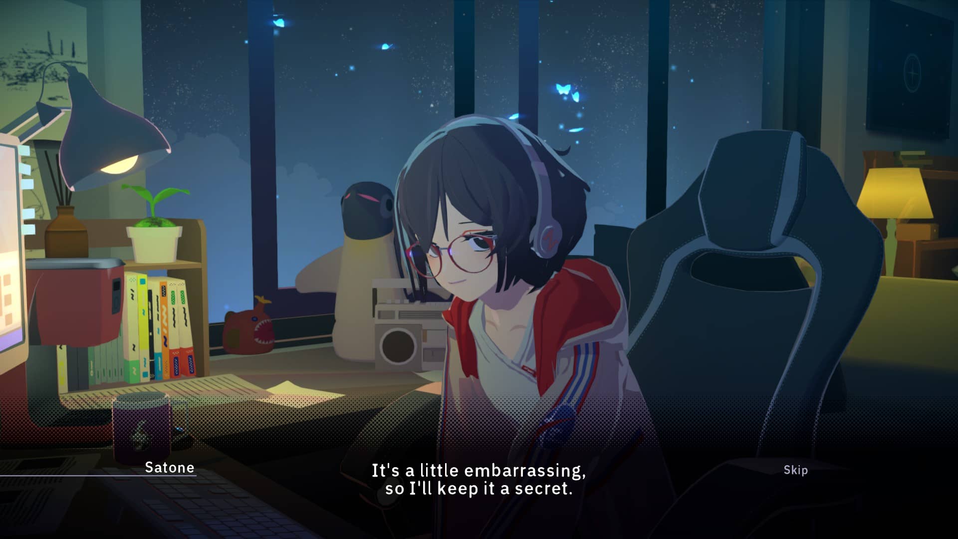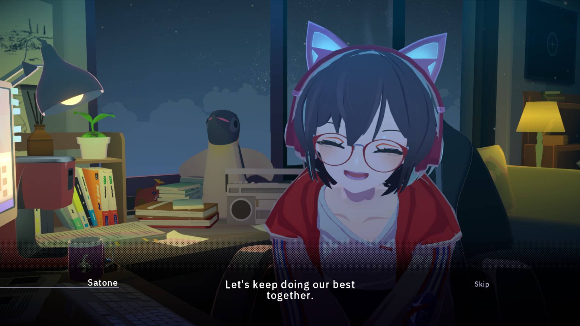 Satone se vám postupně otevírá prostřednictvím krátkých dialogů a příběhových střípků odvíjejících se s každým dalším společně stráveným okamžikem, čímž máte pocit, že na druhé straně skutečně někdo je… i když víte, že jde o digitální postavu. Zkrátka a dobře, čím více času spolu pracujete, tím hlubší je vaše pouto. Většinu času jste spíše pozorovatelem a posluchačem, ale občas dostanete možnost odpovědět. Tyto drobné interakce působí překvapivě přirozeně a nejsou vtíravé. Satone vám sděluje své obavy z budoucnosti, pochybnosti o vlastních schopnostech, radosti z malých úspěchů a mnoho dalších niterných pocitů. Vše je podáno velmi citlivě, bez patosu či zbytečného sentimentu.