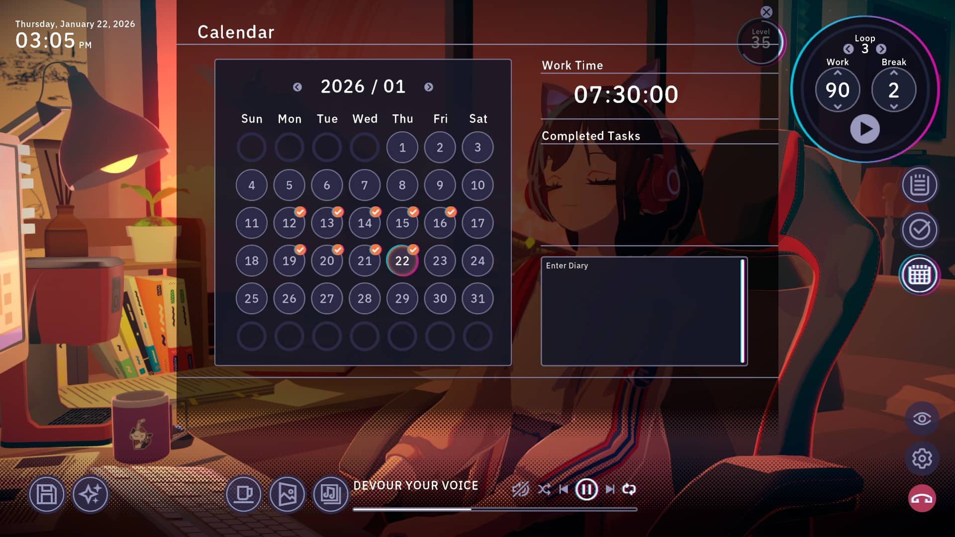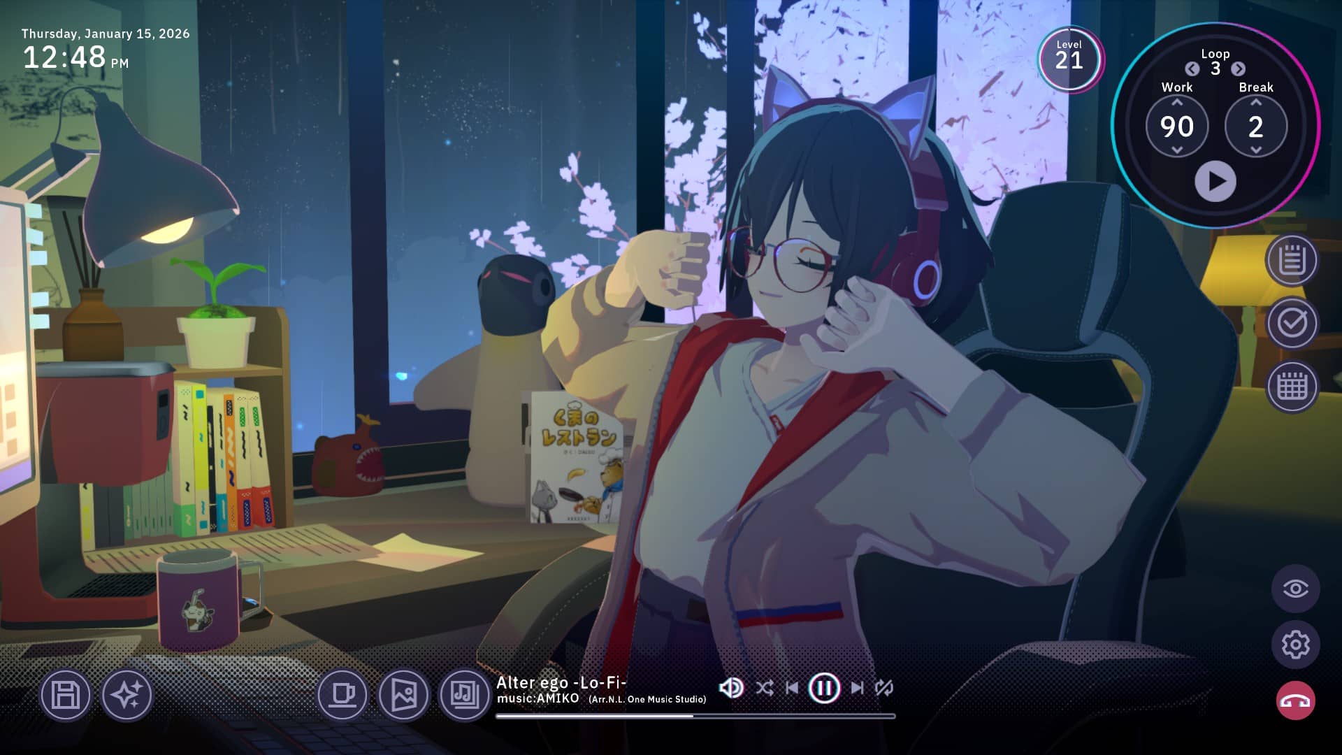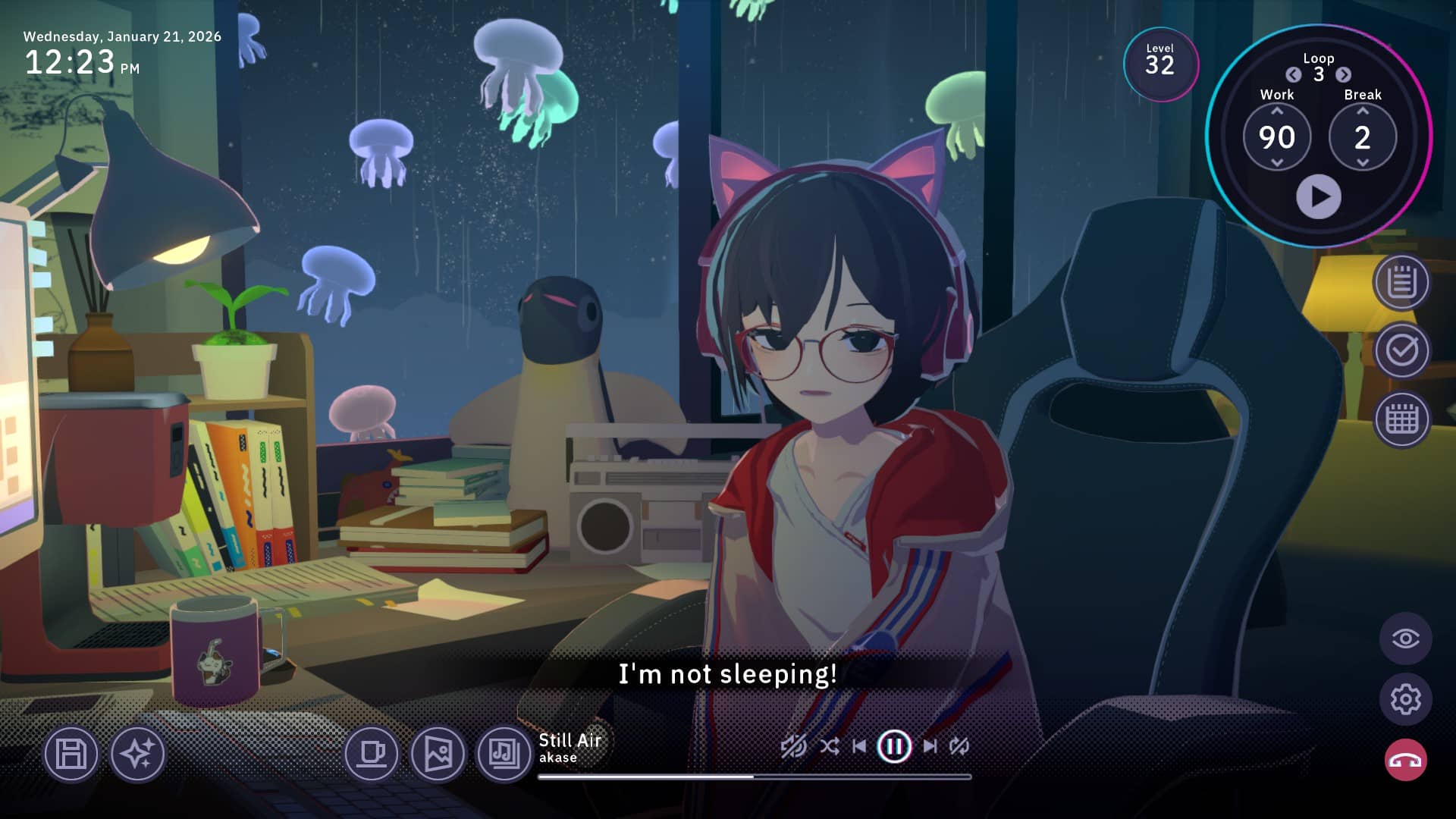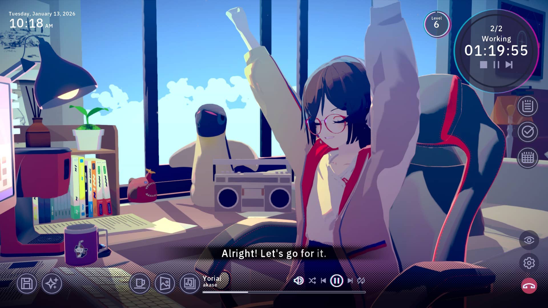 Chill with You: Lo-Fi Story nabízí také praktické nástroje, které z něj dělají plnohodnotného pomocníka při práci. K dispozici je seznam úkolů, kam si můžete zapisovat jednotlivé body a postupně je odškrtávat. Nechybí ani poznámkový blok a kalendář, kde vidíte přehled své aktivity. Tyto funkce nepřebíjejí hlavní zážitek, ale jemně ho doplňují. Vše je navrženo tak, aby vás to nerozptylovalo, ale naopak podporovalo v soustředění. Hra vás nenutí neustále něco kontrolovat, spíše vám nabízí prostor, kam si můžete své myšlenky uložit.