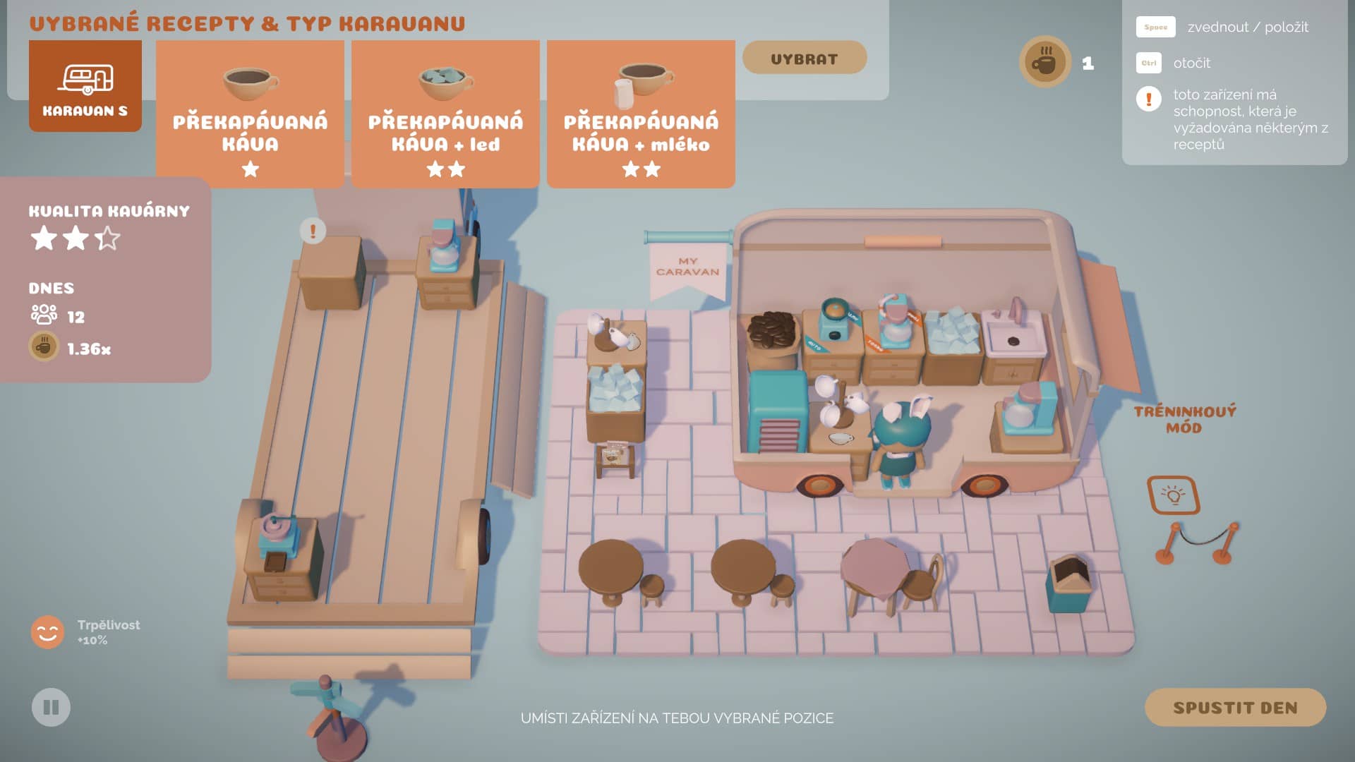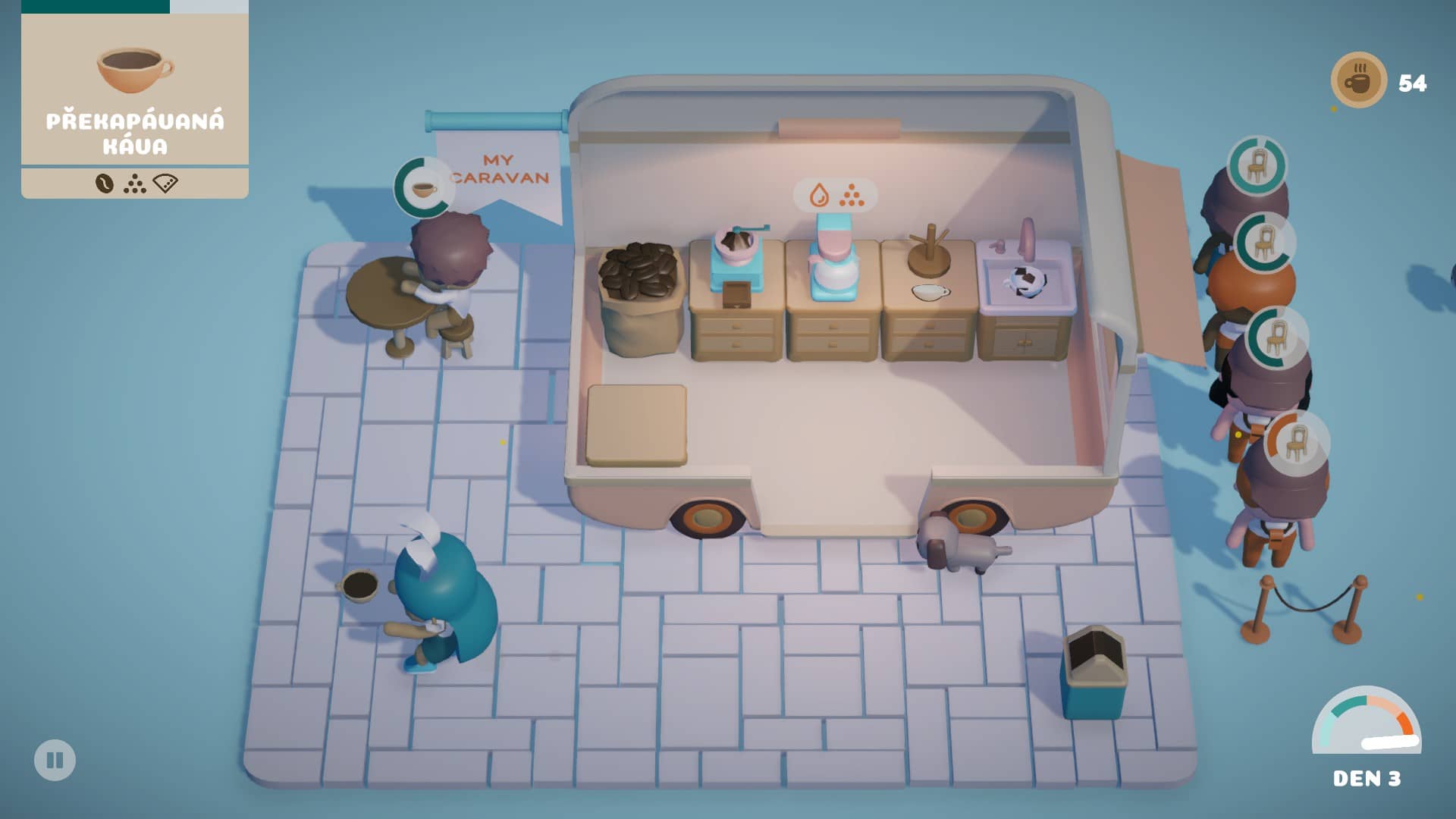 Coffee Caravan je přesně ten typ hry, který na první pohled vypadá jako „roztomilá relaxační záležitost“. Po několika hodinách však zjistíte, že vám nenápadně testuje schopnost plánovat, improvizovat a zvládat stres. To vše pod rouškou přípravy cappuccina. Jde o roguelite manažerskou hru. Kde místo klasické kamenné kavárny provozujete pojízdný kávový stánek, se kterým cestujete mezi lokacemi, obsluhujete zákazníky a snažíte se přežít další den bez toho, aby vám explodoval kávovar nebo došlo mléko v ten nejhorší moment.
