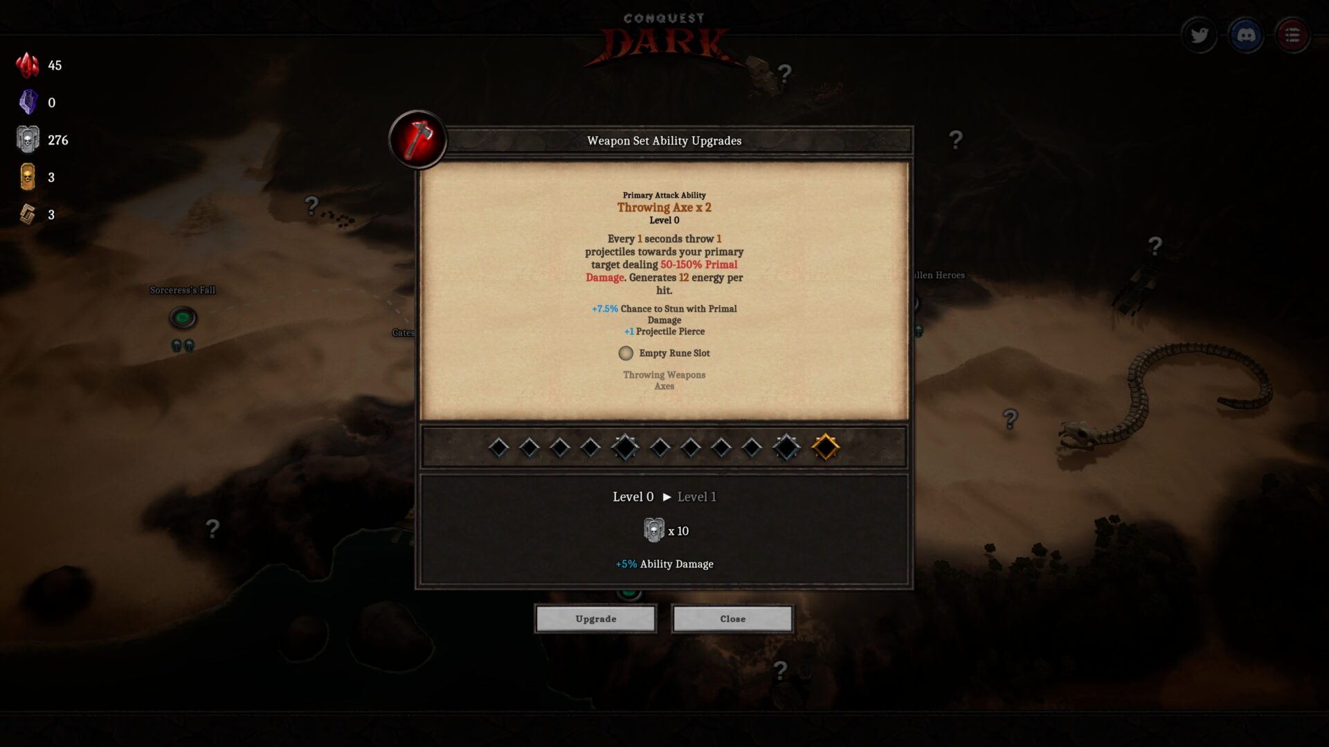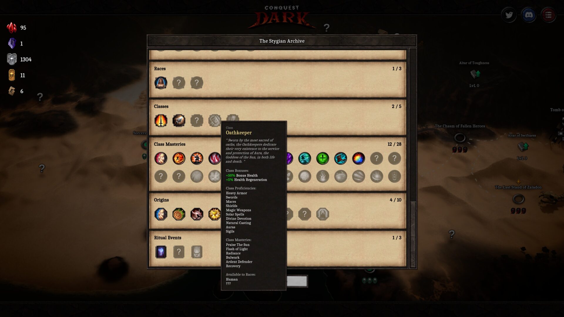 Významnou roli zde hrají RPG prvky. Conquest Dark nabízí různé archetypy postav, z nichž každý má vlastní schopnosti, silné a slabé stránky. Tyto archetypy zásadně ovlivňují styl hraní a nutí vás přizpůsobit strategii nejen aktuálnímu běhu, ale i dlouhodobému plánu vývoje. Během hry získáváte nové schopnosti, pasivní bonusy a vylepšení, včetně zbraní a setů brnění, které lze různě kombinovat. Právě experimentování s buildy patří k nejsilnějším stránkám hry a je hlavním důvodem, proč se k ní vracet.