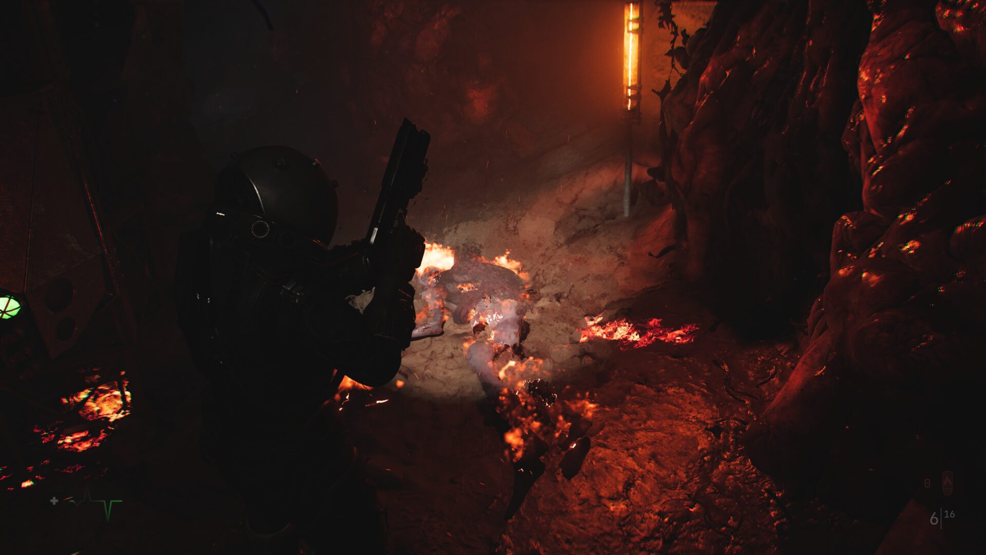 Tím se dostáváme k soubojům a bojovému systému. Bojový systém je pomalý, těžký a záměrně nekomfortní. Nejedná se o chybu, ale má to své opodstatnění. Postava se pohybuje v těžkém skafandrua její pohyby mají realistickou setrvačnost. To není nedostatek, ale designový záměr a nutno zmínit, že funguje tak dobře, že vám to bude někdy až pít krev. Díky tomu je pocit z každého střetu intenzivní. Nepřátelé jsou neúprosní a dokážou překvapit. Někdy útočí přímo, jindy se plíží zpoza stínů, nebo vás donutí panicky couvat.