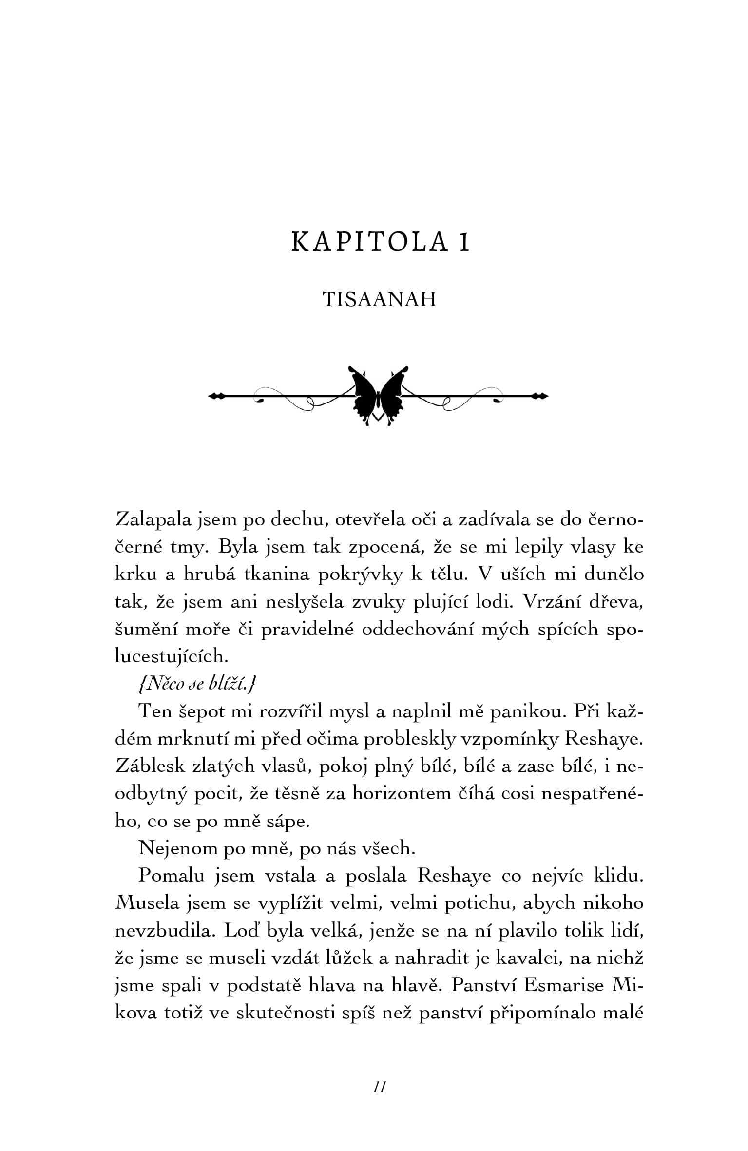 Do děje se přidává třetí perspektiva, která zpočátku působí chaoticky a vytrženě. Pohled bojovnice a princezny Domu Obsidiánu, Aefe, jež se narodila poskvrněná a už její samotná existence je hříchem, nás zavádí do zemí Feyů. Bájný národ čelí krutým útokům. Lidé vyvražďují celé rody a nikdo neví proč. Spolu s průzkumným týmem se Aefe vydává zjistit, co stojí za lidskou agresí. Zpočátku si čtenář klade otázku, jaký význam má tato linie pro Tisaanahin příběh? Proč se autorka rozhodla podělit o takovou hrůzu a jak spolu tyto světy souvisejí? Odpověď je jednoduchá a zároveň znepokojivá. Souvisí velmi.