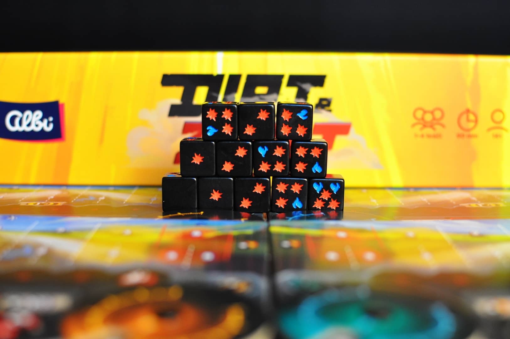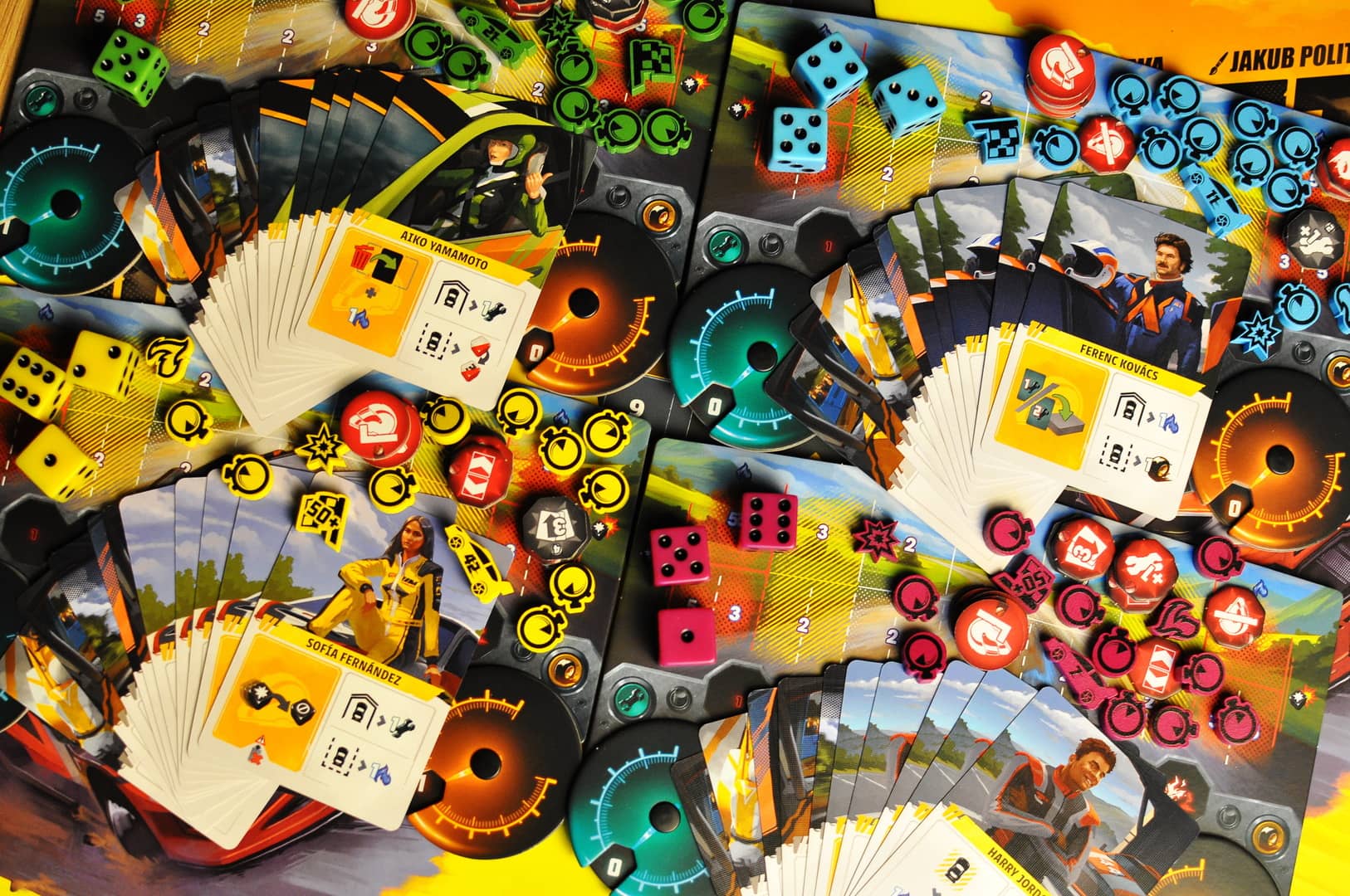 Dirt & Dust se prezentuje jako závodní hra z prostředí rallye. Čím více partií ale máte za sebou, tím jasněji si uvědomíte, že o samotné závodění v klasickém smyslu tu vlastně příliš nejde. Nenajdete zde předjíždění, přímý kontakt ani dramatické souboje kolo na kolo, jak jste zvyklí například z her jako HEAT nebo Rallyman GT. Těžiště hry leží jinde, konkrétně v optimalizaci tahů, kontrole kostek, efektivním využívání karet a dlouhodobém plánování. Auto zde funguje spíš jako ukazatel stavu než jako závodník, trať pak připomíná časovač bodování. Samo o sobě to není špatně, ale hráče, kteří čekají silný pocit rychlosti a soupeření, může čekat studená sprcha.