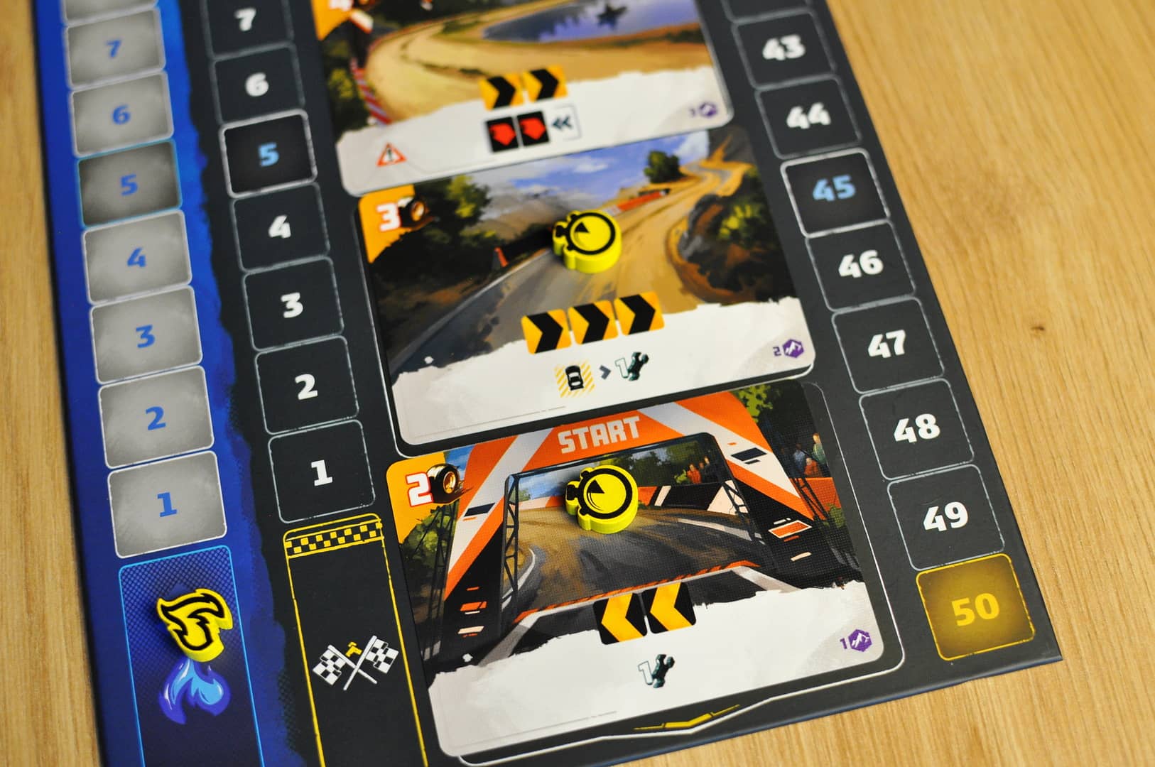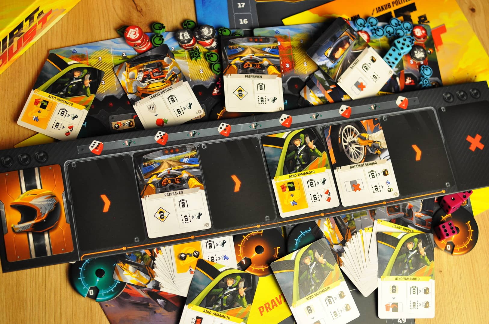 Jedním z nejsilnějších prvků Dirt & Dust je bezesporu poziční část na desce hráče. Rozdělení na horní řadu zrychlení a spodní řadu zpomalení spolu s barevnými zónami (šedou, žlutou a červenou) funguje mechanicky i tematicky výborně. Jedeš-li na hraně, riskuješ, ale diváci to milují. Sice místo rychlostních (vítězných) bodů získáváš popularitu, ale stálo to za to. Právě tady hra velmi dobře propojuje téma s mechanikami.