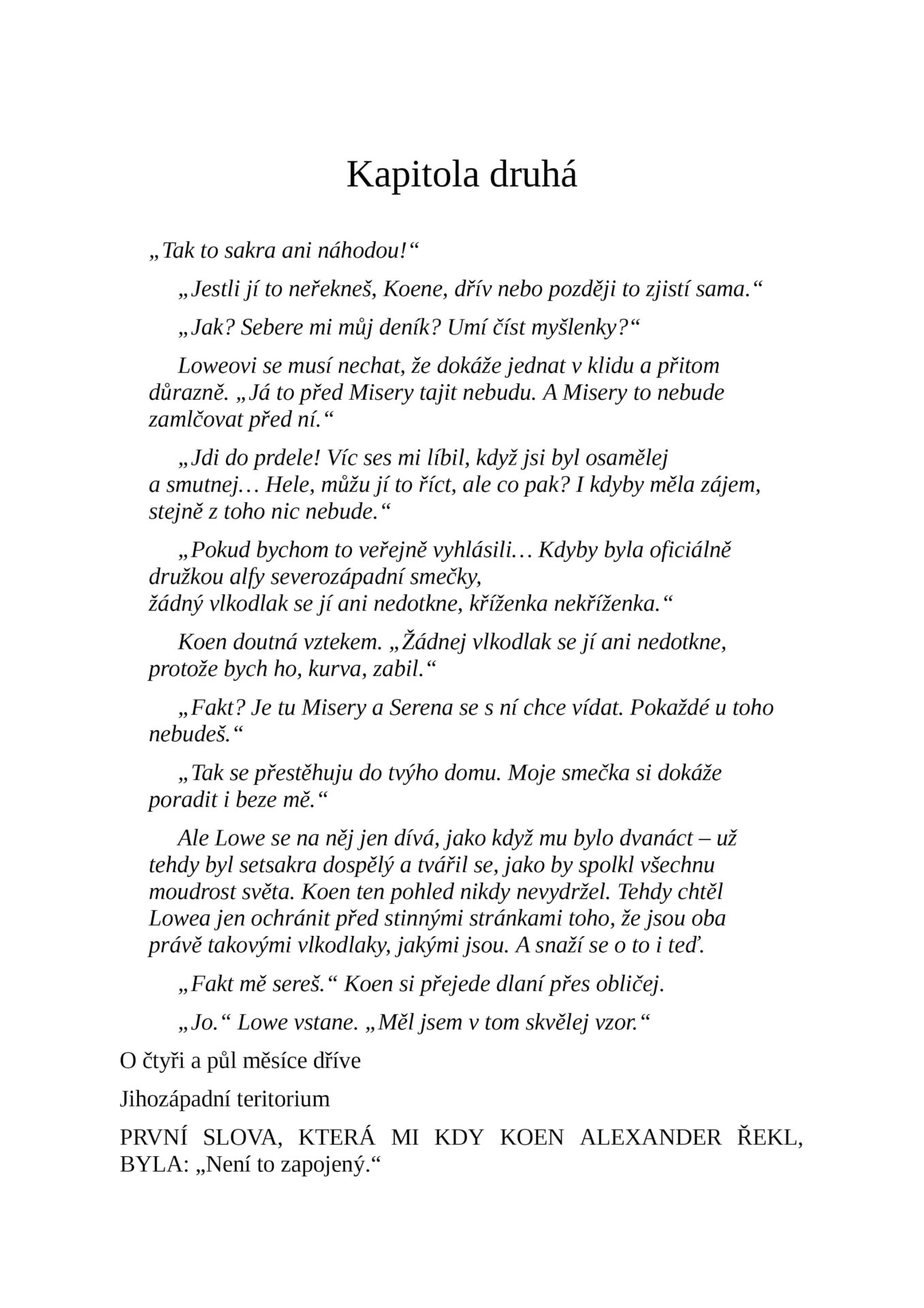 „Chci, abys ze mě byla strachy podělaná až za ušima, Sereno. Chci, aby ses mě bála tak, že si ani ve snu nedovolíš mě neposlechnout. Chci, abys měla pocit, jako bych měl ruce sevřený kolem tvýho měkkýho krčku, a chci, aby ses natolik děsila, že ti ho rozervu na cucky, že když řeknu, abys něco udělala kvůli svýmu posranýmu bezpečí, ani tě nenapadne odpovědět něco jiných než ‚Ano, alfo‘.“