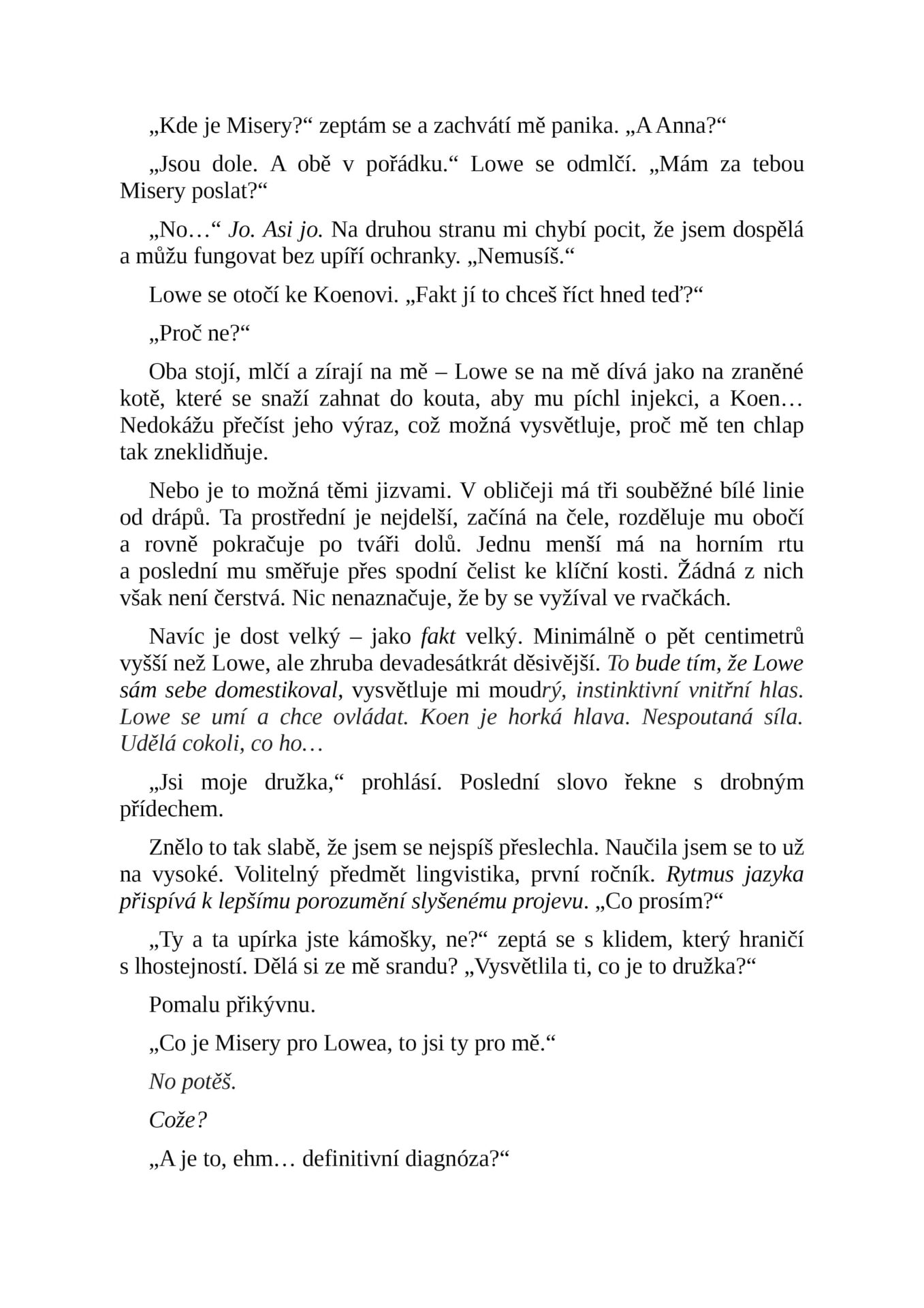 V tuhle chvíli mu nedokážu lhát nebo něco předstírat. Podívám se mu do očí. „Ne, ale bojím se, že jestli… se mě okamžitě nedotkneš, budu křičet. A pokud to nezabere, začnu tě prosit. A pokud ani to nepomůže, tak se – rozpadnu na milion kousků a budu dál žadonit a udělám cokoliv –“ Zasténá, přitáhne si mě k sobě na krátký, blažený okamžik si mě přitiskne k tělu. Rychle ve mně narůstá horko, a když se začnu vzpínat proti jeho tvrdé bouli, která mě tlačí do břicha, odtáhne se a opatrně řekne: „Musíme toho nechat, Sereno.“