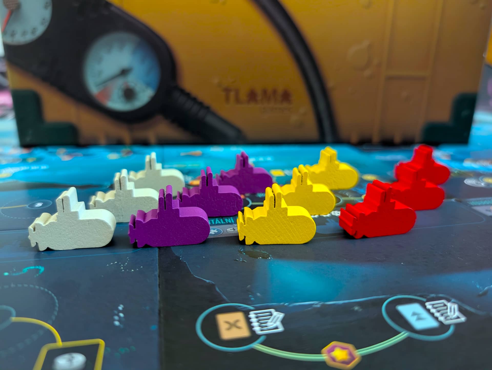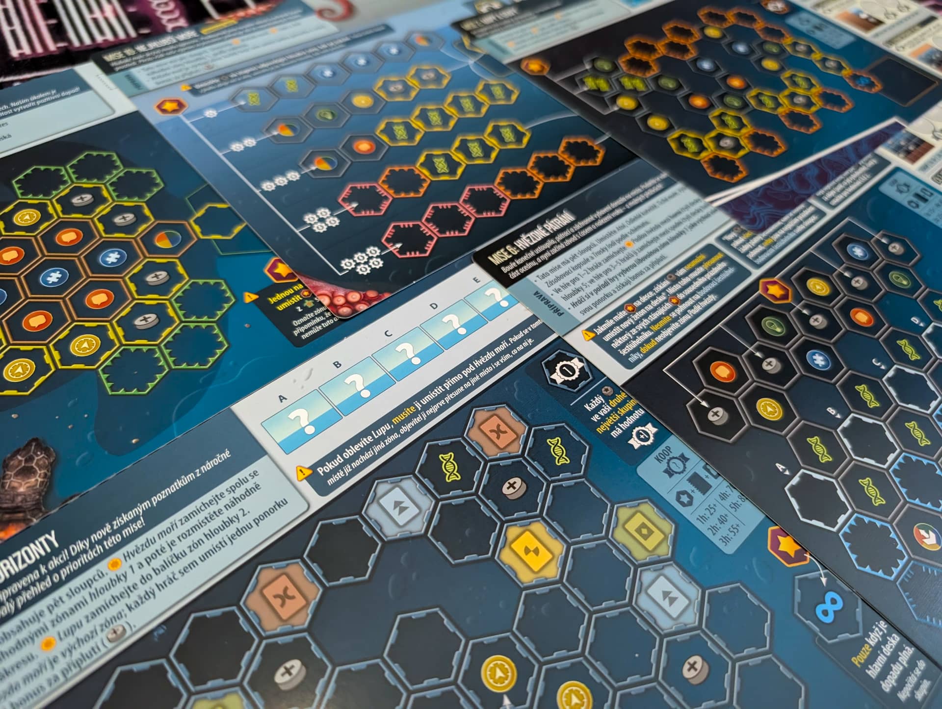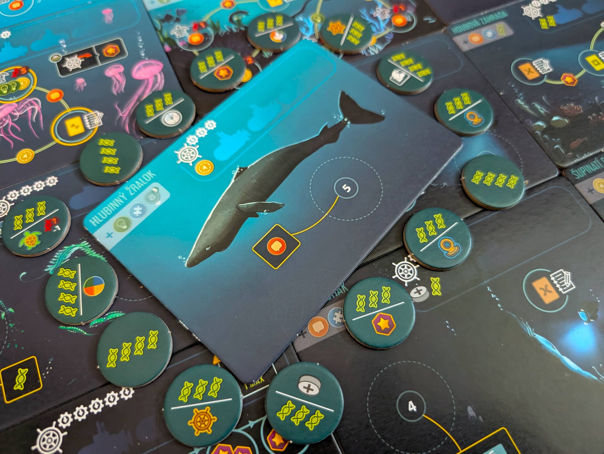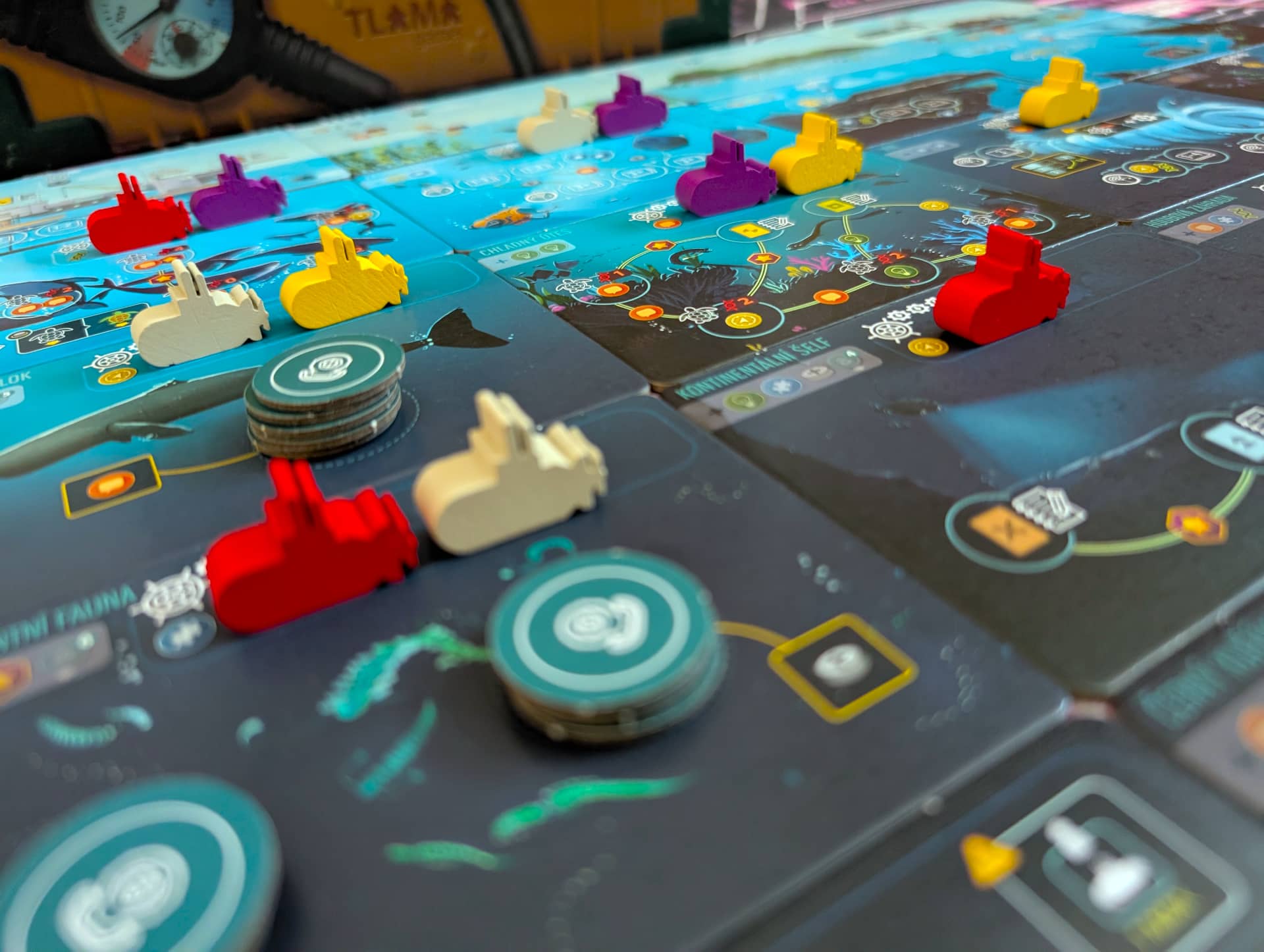 Velmi také oceňuji množství desek zón, které se ve hře nacházejí. Během partie jich na stůl nedostanete ani polovinu a obzvlášť ve větších hloubkách každá zóna nabízí jiný a zajímavý zážitek. Chcete prozkoumávat podmořské jeskyně, které jsou moc úzké na vplutí s ponorkou a musíte je objevovat z vedlejších zón? Není problém. A co takhle potkat hlubinného žraloka, u nějž vám každý ponor zajistí reputaci? Objevovat různé dílky, které hra nabízí, je opravdu zábava a při každém sonaru se těšíte, co dalšího vás potká.
