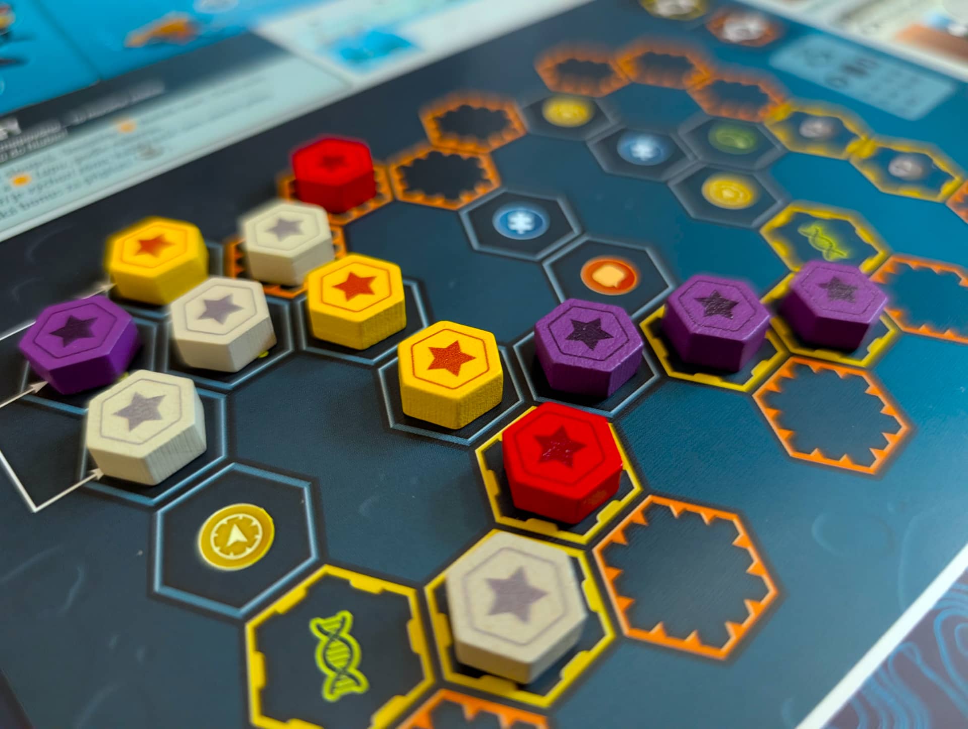 Obecně jich je ve hře pět, což je tak akorát na to, aby byla hra zajímavá, ale zároveň dost málo na to, aby ji pochopili i nováčci. Většinou akce vyžadují, abyste měli ponorku v zóně, která danou akci umožňuje. Nezmínila jsem se ještě o poslední stupnici na vaší hráčské desce, kterou je stupnice vynalézavosti. Ta vám občas poskytne další ponorku, hlavně ale říká, jak hluboko se s ponorkou můžete ponořit a jak daleko z výchozí zóny s ní můžete plout. Právě cestování je totiž první a nejjednodušší z oněch pěti akcí. Pokud stejně jako já milujete hry, které vás neustále za něco odměňují, pak vězte, že cestování je moc milá akce, kterou se nejen dostanete do zóny potřebné pro ty ostatní akce, ale ještě vám každá zóna, v níž cestování ukončíte, dá nějaký bonus. Tím může být DNA, posun na některé stupnici nebo třeba i nový disk.