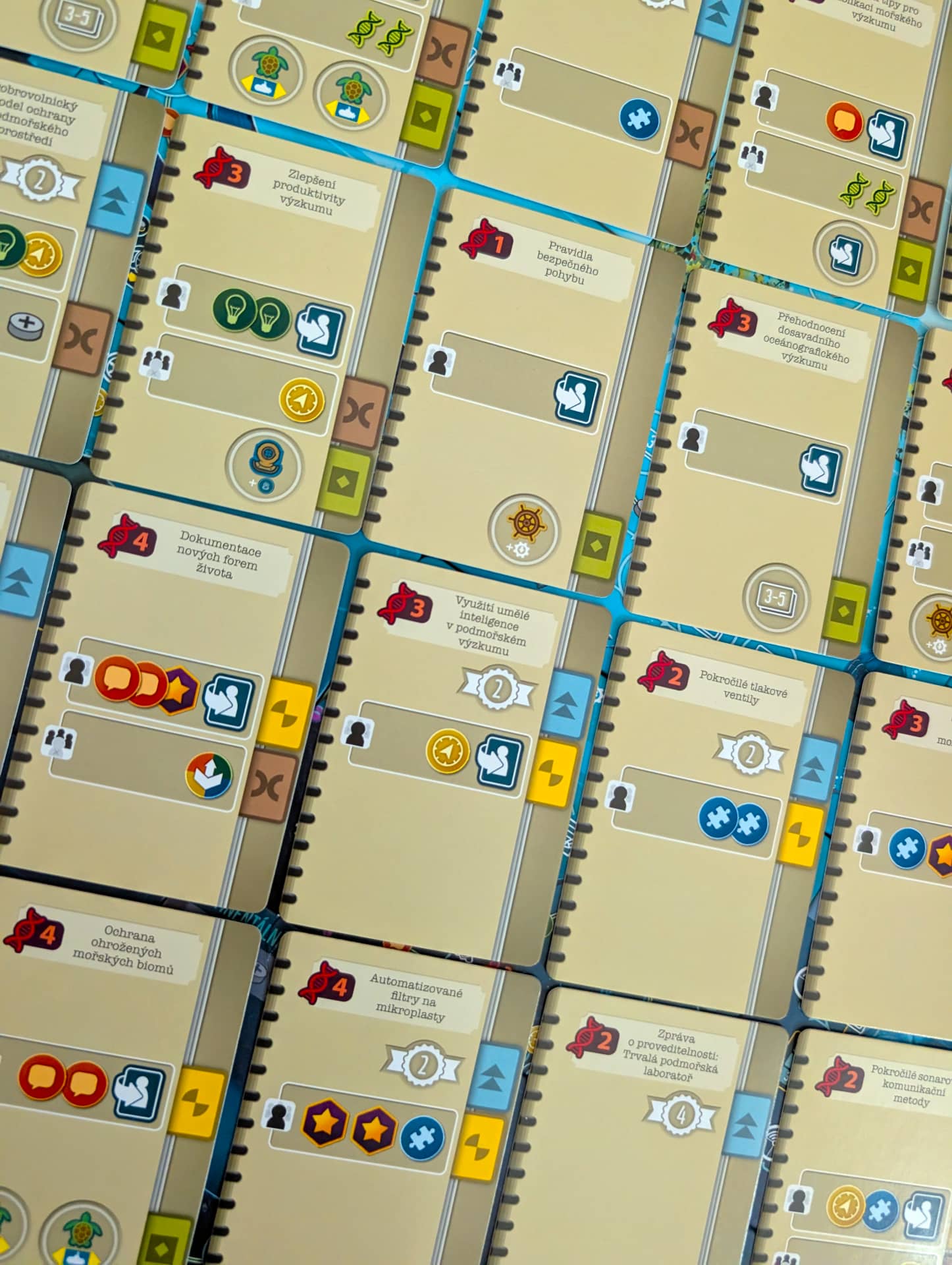 Každé zakryté pole pro ochranu života poskytuje nějaký silný bonus. Výzkum vám umožní napsat publikaci, tedy získat kartu, která dá bonus vám a často i slabší protihráčům. Proč byste to dělali? Ten bonus pro vás je silný, jako například trvalé vylepšení nějakého specialisty nebo možnost ochrany života, aniž byste v dané zóně měli ponorku. A občas jsou na kartě i vítězné body. Váš výzkum ale umí trochu potrápit to, že každé pole umožňuje napsat jen výzkum nějaké konkrétní barvy, a ta zrovna nemusí být v nabídce ve chvíli, kdy vy můžete akci provést.