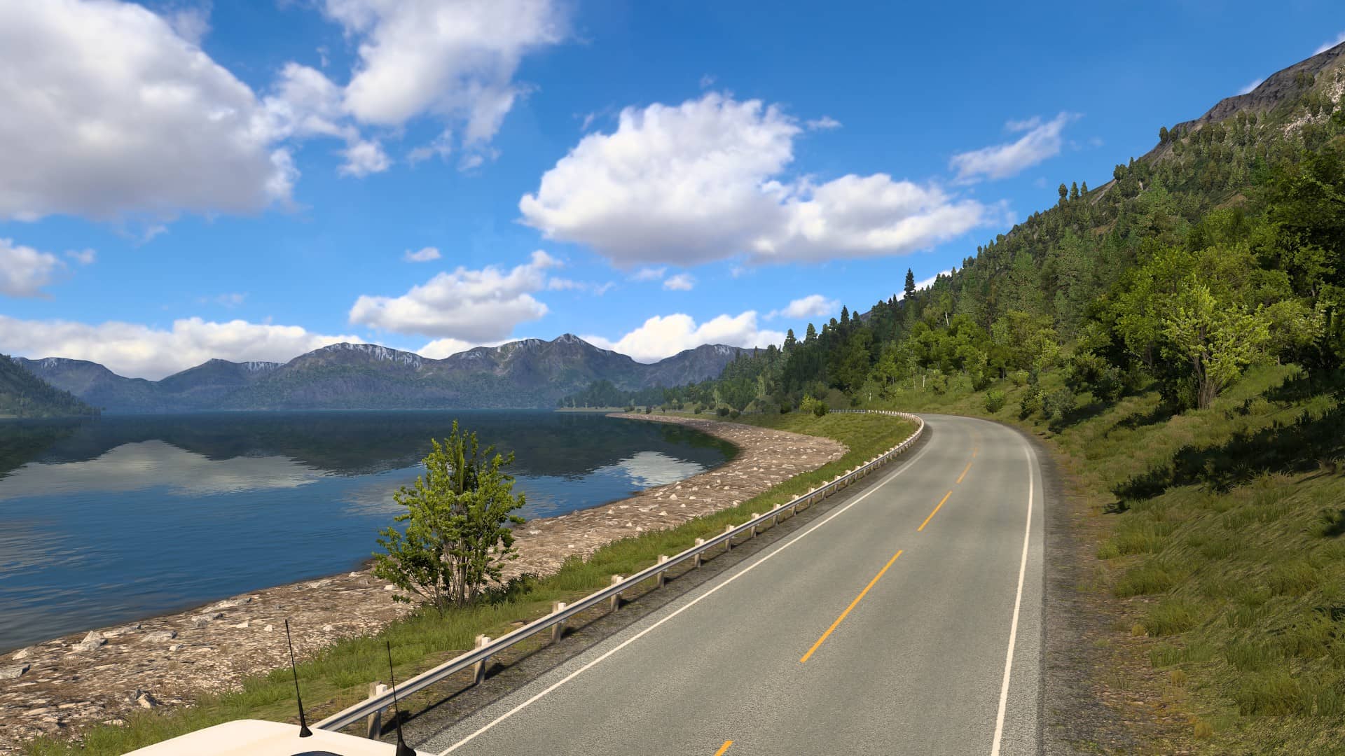 Když už jsme načrtli zasněžené kopce, za asi největší negativum tohoto rozšíření považuji absenci sněhové pokrývky na silnicích, stromech a okolí. Asi chápu, že na ostatních částech mapy by to nedávalo příliš smysl, hlavně v jižních částech Evropy. Ovšem reálné zpracování sněhové pokrývky, zasněžených silnic a především sněžení by v Euro Truck Simulator 2: Nordic Horizons naopak smysl dávalo a určitě by to vykreslilo i větší autentickou atmosféru. Nedá se ale holt nic dělat, stále nám k radosti bude muset stačit déšť a jeho různá intenzita, která se střídá se slunným modrým nebem. Za mě je to rozhodně velká škoda, zvláště když už třetí rok tvůrci lákají na vánoční event Wonders of Winterland, které nás pokaždé zavede do zasněžené zimní krajiny. Tento event dokazuje, že sníh a s ním i spojenou fyziku SCS Software umí. Uvidíme, jestli se něco změní na nadcházejícím Islandu, který má naplánované datum vydání na rok 2026, avšak v přiložených screenshotech, jež tvůrci ukázali, to zatím na žádnou změnu nevypadá.