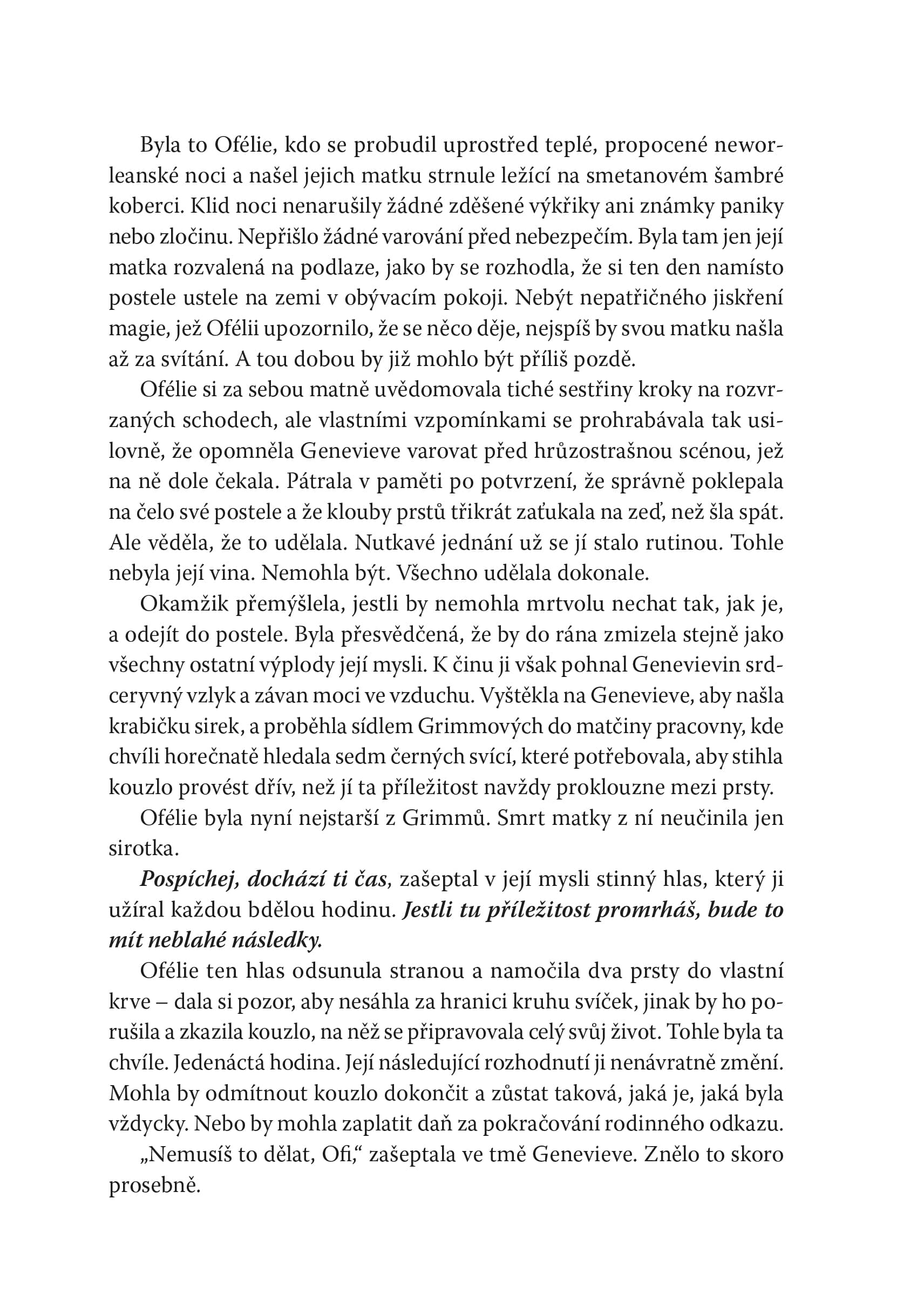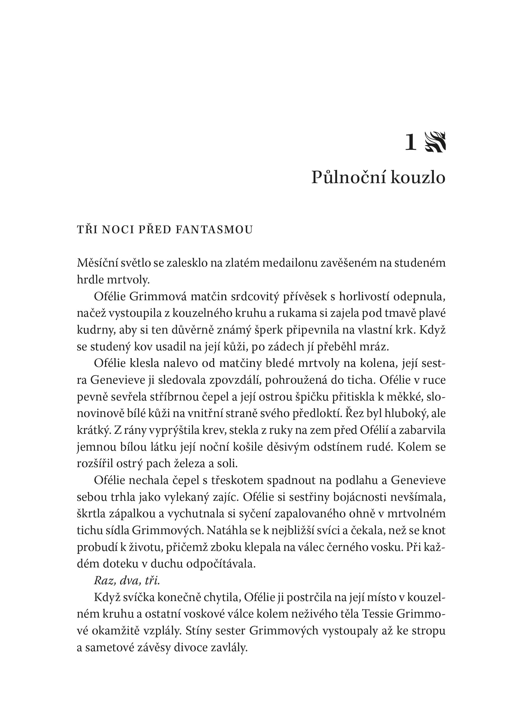 Ofélie a Genevieve Grimmovy truchlí. Když jejich matka zemře, nezůstane po ní jen hromada otázek a dluhů, ale také dědictví, které páchne smrtí. Ofélie musí přijmout břemeno, které jí bylo předurčeno, a převzít nekromantskou magii její rodové linie, i když touží po svobodě. Genevieve však zvolí zbrklou a zoufalou cestu, jak ochránit domov, jenž jim banka hrozí zabavit. Vstupuje do Fantasmy, kde většina soutěžících nepřežije. Sen o magické ceně však láká stále nové účastníky, přestože po sobě zanechává pouze krvavou stopu. Když se Ofélie dozví o sestřině činu, neváhá a vydává se za ní, aby ji ochránila. Jenže život je nevyzpytatelný dokonce i po smrti a sídlo i ďáblové v něm mají své vlastní plány.