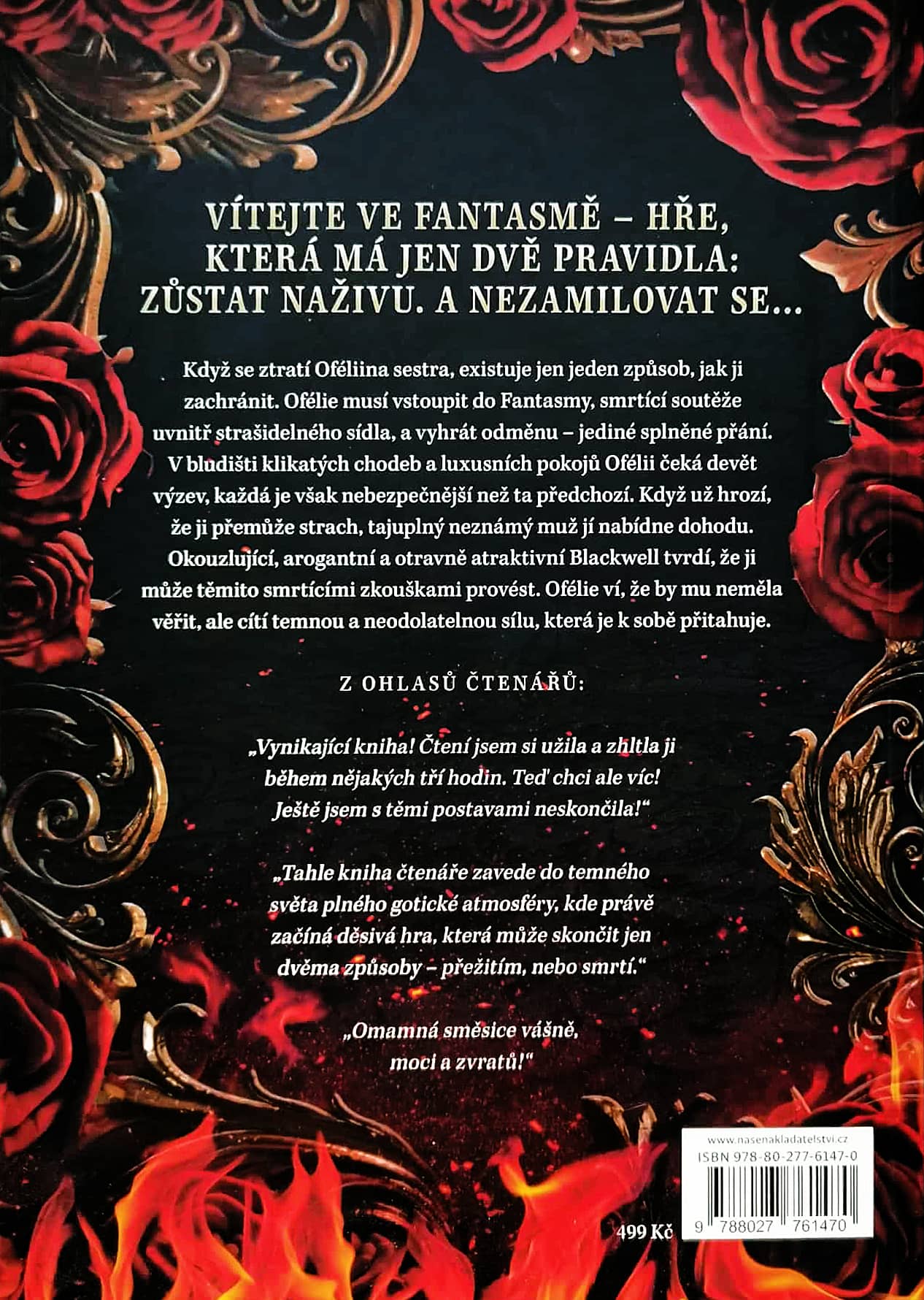 Fantasma není jen obyčejná hra. Je to smlouva s ďáblem, který si vybírá požitky po troškách. Každá zkouška láme nejen tělo, ale také duši. A právě tam se Ofélie setkává se záhadným fantomem, který jí nabídne pomoc. I když jí to přijde draho, bez něj všemi úrovněmi neprojde. Jejich dohoda je prostá: on jí pomůže přežít, ona mu pomůže získat svobodu. Jenže i svoboda má svou cenu a ve Fantasmě je ztráta srdce nebezpečnější než prohra. Blackwell má naneštěstí jazyk ostrý jako břitva a tělo spíše z pokušení než z masa, takže zkoušky budou Oféliin nejmenší problém.