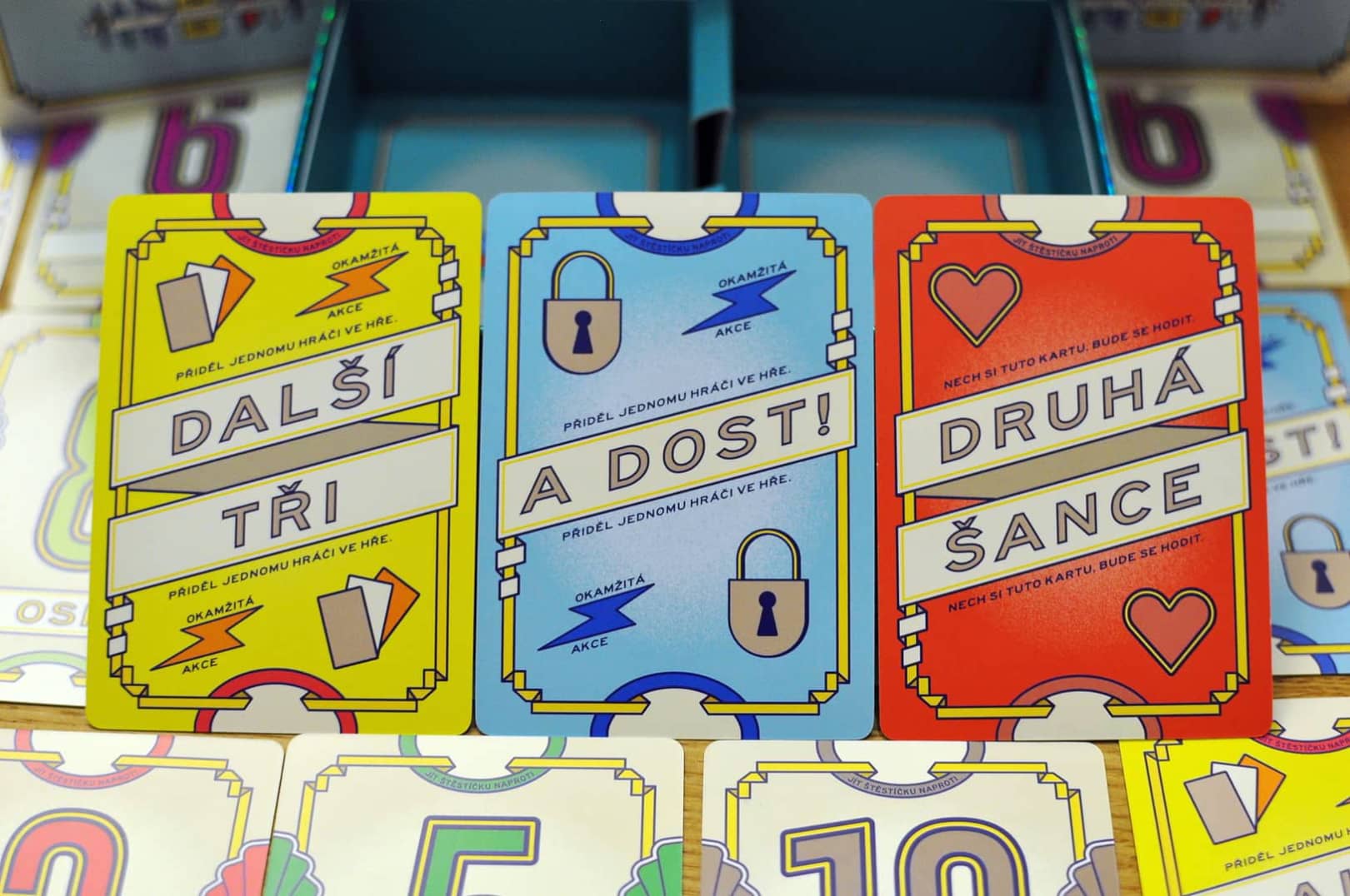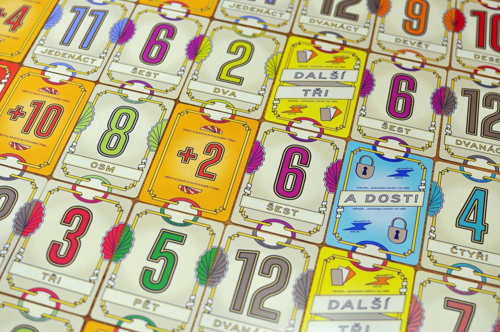 Balíček obsahuje 79 číselných karet s hodnotami od nuly do dvanácti, přičemž čím vyšší číslo, tím častěji se v balíčku objevuje. Nechybí ani akční karty a modifikátory, které dokážou situaci na stole nečekaně změnit. Karty jako Druhá šance nebo Další tři přinášejí krátké zvraty, ale nikdy nenarušují plynulost hry.