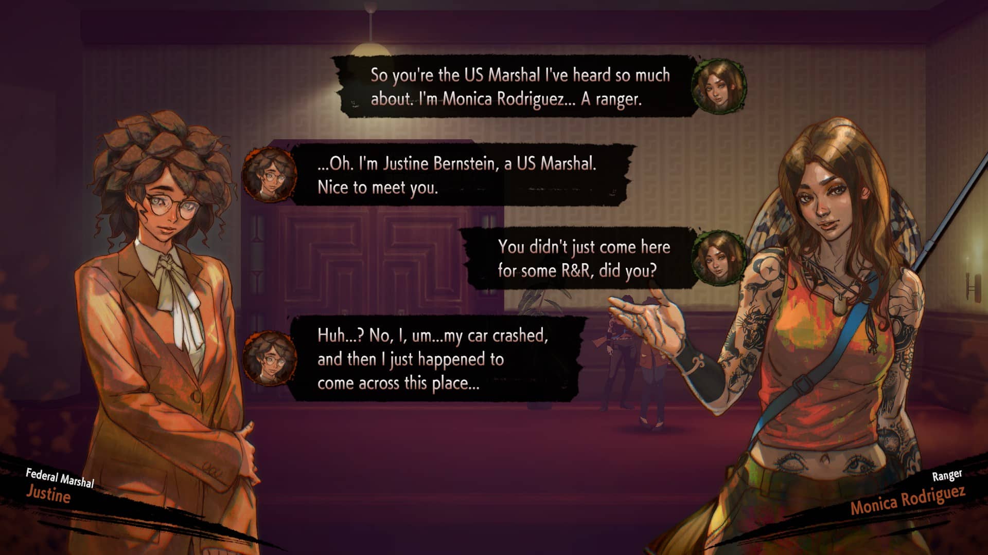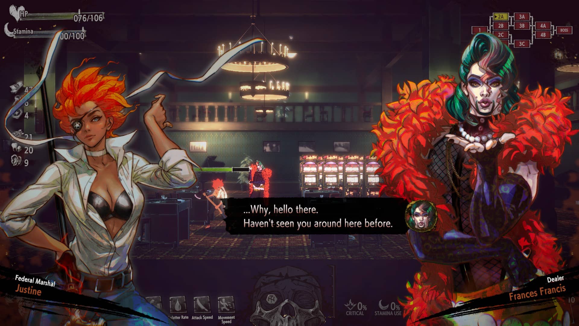 Narativní styl je typický pro oba tvůrce. Fragmentovaný, plný symboliky, násilných vizuálních metafor a nečekaných zvratů. Titul se záměrně vyhýbá přímému vysvětlování a spíše vás nutí k osobní interpretaci. Každý zabitý boss neodhalí pouze kus příběhu hotelu, ale také hlubší aspekt vztahu Justine a Carnivala. Sdílená mysl se projevuje nejen v dialogu (pravděpodobně vnitřním monologu, který je neustále narušován Carnivalovými sarkastickými nebo krvelačnými poznámkami), ale i v herních mechanikách, což je geniální propojení děje a hratelnosti. Jsme svědky toho, jak zoufalá snaha o přežití nutí Justine přijmout svou temnou stránku, aby dosáhla spravedlnosti. Nebo se nakonec stane jen dalším monstrem?