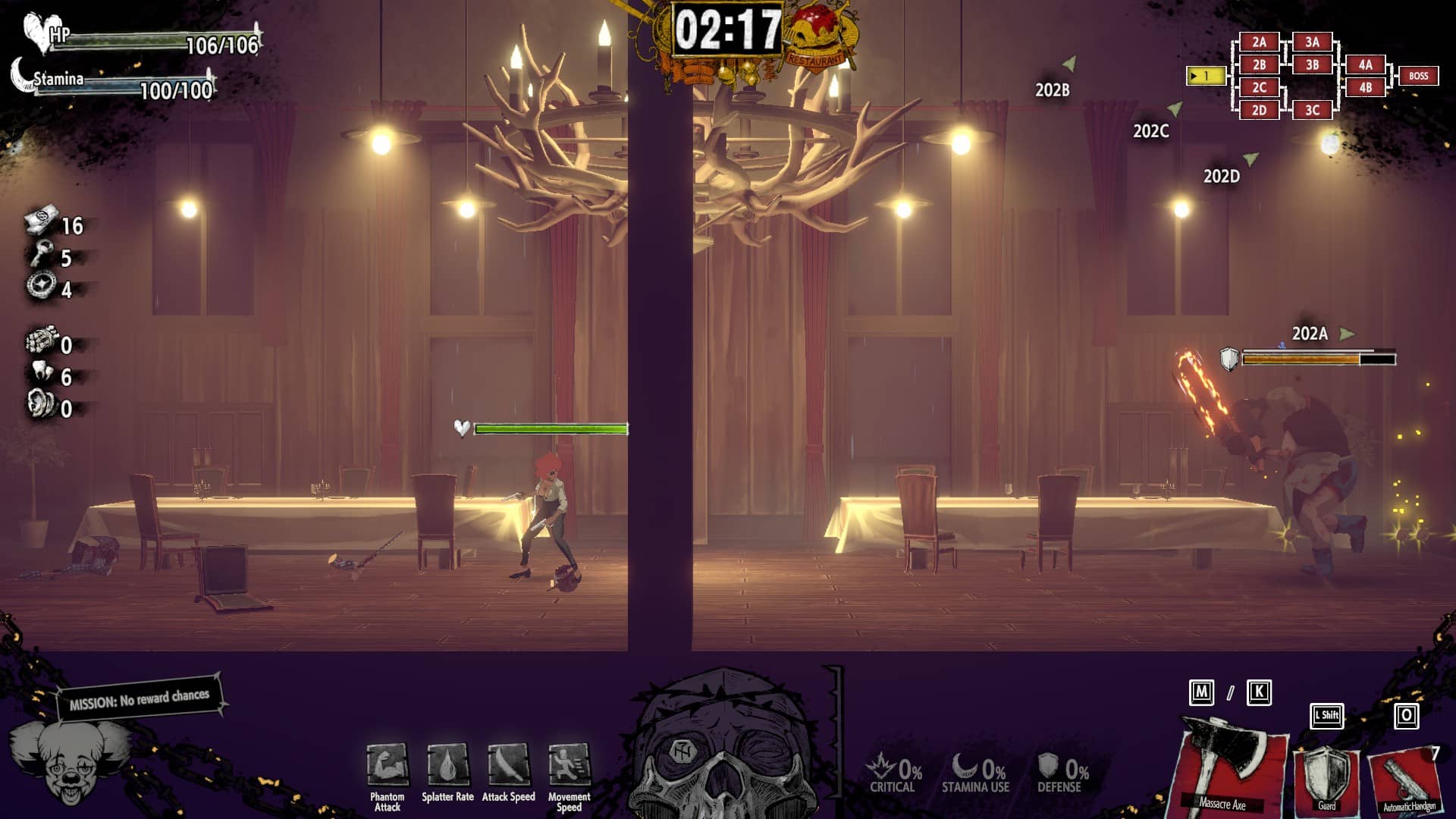 Nejradikálnější a nejinovativnější mechanikou titulu jsou bezesporu Slasher Phantoms. Hotel Barcelona bere koncept roguelike žánru a převrací ho naruby. Každá smrt neznamená jen restart nebo ztrátu pokroku, ale zrod vzpomínky na vaše minulé já, fantoma, který přesně opakuje vaše pohyby z předchozího pokusu. Tito fantomové se pak stávají strategickými nástroji. Mohou sloužit jako štíty, které absorbují poškození, spojenci, jejichž útoky zasahují nepřátele, nebo rozptýlení, které odvede pozornost bossů a poskytne vám prostor k protiútoku. Tato mechanika vás povzbuzuje k experimentování a dokonce i k plánovaným sebevraždám v náročných pasážích, abyste si vytvořili vlastní armádu Fantomů. Každým neúspěchem se tak vaše síla násobí – paradoxní metafora pro psychologické trauma, kdy se vaše minulé chyby stávají vašimi zbraněmi.