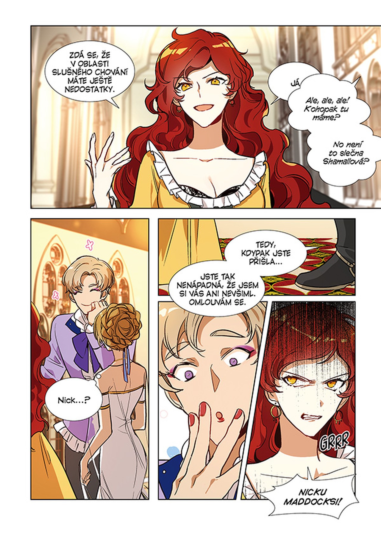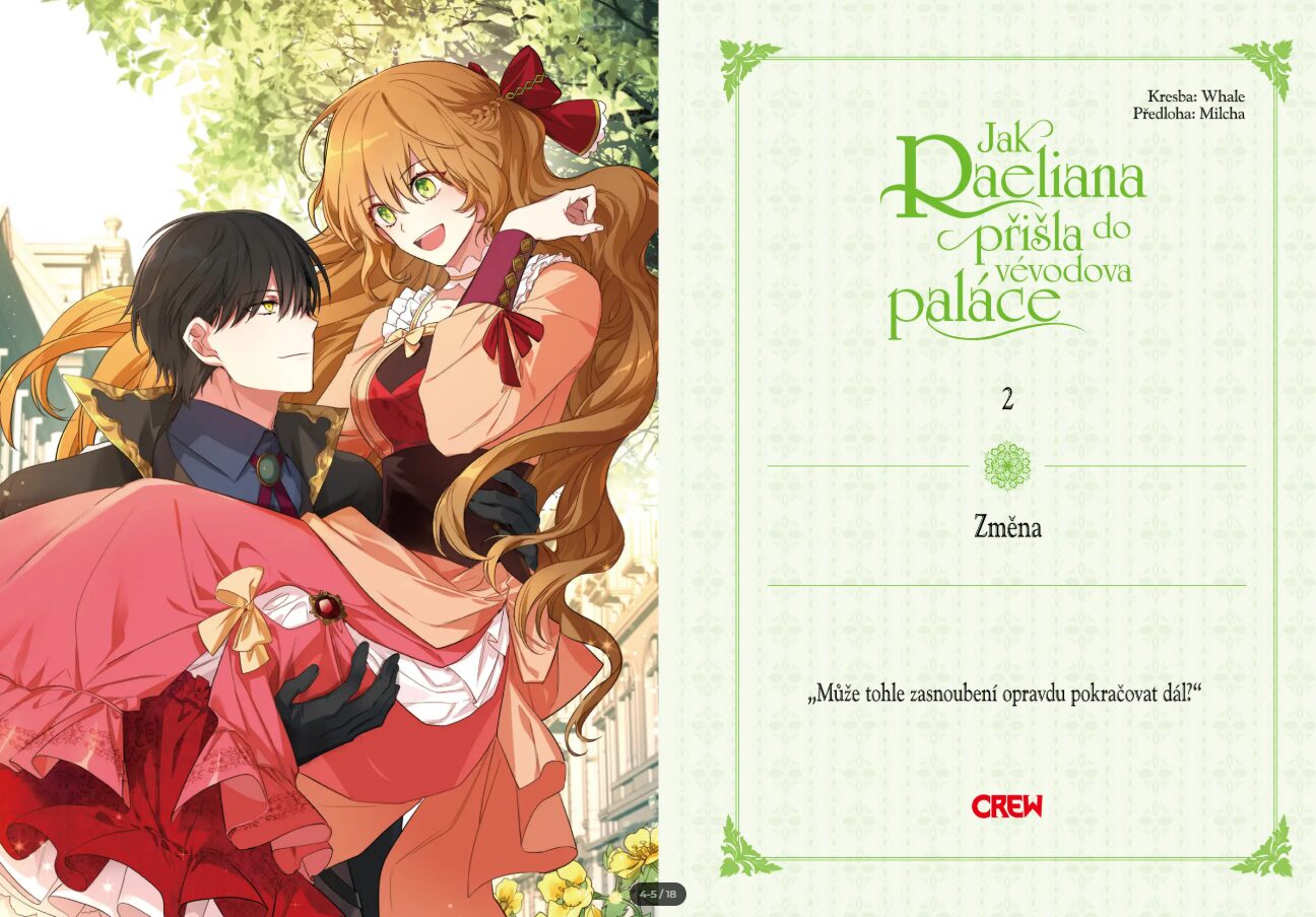 Druhý díl více rozvíjí dynamiku mezi Raelianou a vévodou Noahem Wynknightem. A je to jiskření, které by mohlo zapálit celý palác. Noah je fascinující. Na veřejnosti hraje roli dokonalého, zamilovaného snoubence, který by pro Raelianu snesl modré z nebe, jeho úsměvy jsou sladké jako med, ale oči zůstávají chladné (což jde i díky kresbě krásně vidět). Bohužel, nevidíme pořádně, co se děje v soukromí, za zavřenými dveřmi kočárů a pracoven. Nicméně víme, že je to manipulátor, jenž Raelianu neustále testuje, popichuje a baví se jejími reakcemi. Včetně toho, jak geniálně druhou část zakončí. Teda, to ještě nevíme, protože dílo skončí v tom nejlepším, ale mám odhad a trošku se na Nakladatelství Crew hněvám, ale to jen malililinnko, protože jsem jak na udičce na další část.