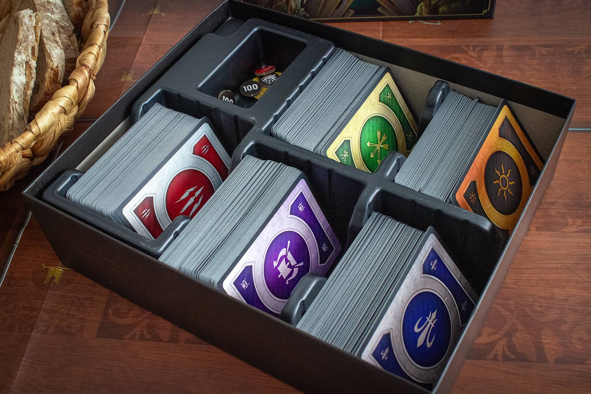 První, čím vás Gwint upoutá, je krásné balení. Vnější obal s parciálním lakem nádherně podtrhuje ikonickou ilustraci Geralta a Ciri. To největší kouzlo se ovšem skrývá uvnitř. Insert je řešen tak, že se do něj jednotlivé balíčky vejdou perfektně uspořádané, i když je opatříte ochrannými obaly. Netřeba tak shánět samostatné krabičky pro každý balíček zvlášť. Vše je pěkně pohromadě připraveno k přenášení a karty se vám jen tak nepromíchají… praktické a estetické zároveň, zkrátka chytré řešení. Kromě stohů karet najdete pod víkem také obsáhlá pravidla ve dvou příručkách, která vás provedou nejen základním hraním, ale také dalšími herními režimy včetně týmového 2v2 či volného boje pro pět hráčů. Nechybí ani papírová herní podložka coby bitevní pole, kartonové počítadlo bodů, kartonové žetony a opět kartonová mince pro určení začínajícího hráče.
