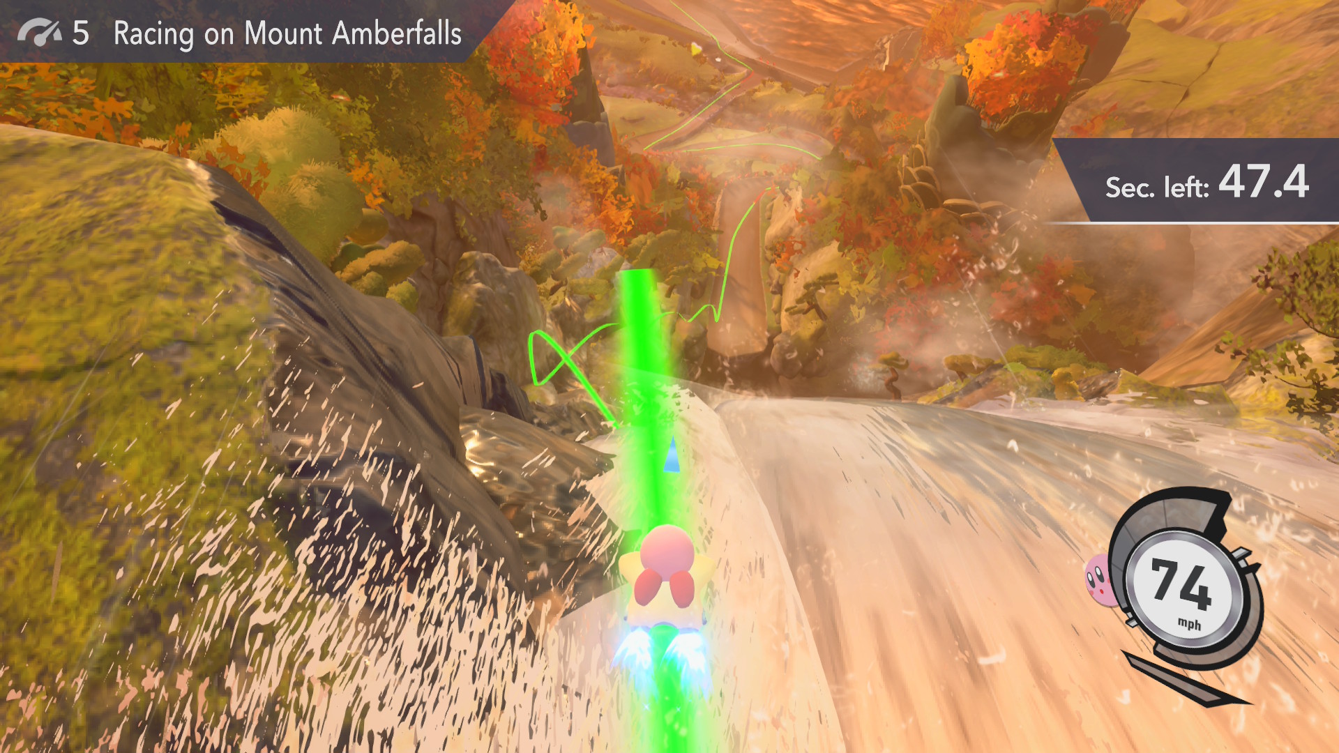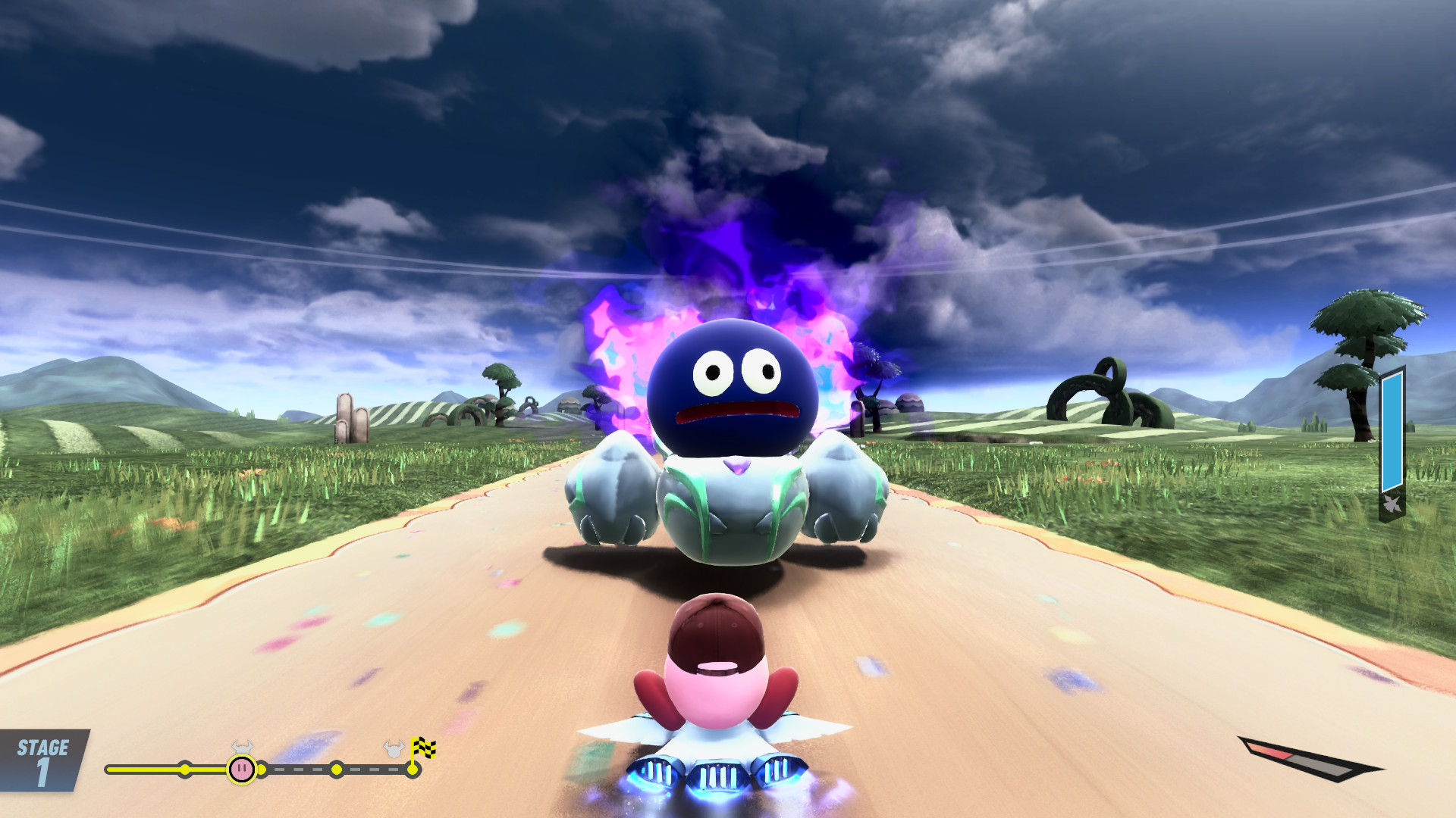 Základní stavební kámen celé hratelnosti je nezvykle jednoduchý. Váš stroj se rozjede sám a vy se soustředíte na směr, drift, schopnosti a boost. Zní to banálně, ale jediná akční klávesa B v sobě ukrývá tolik možností, že působí jako multifunkční panel, na který vývojáři přilepili vše, co se nevešlo jinam. Zpočátku to může mást, ale design je promyšlený a postupně se začnou jednotlivé akce přirozeně doplňovat. K tomu se přidává typická Kirbyho schopnost nasávat protivníky a kopírovat jejich vlastnosti, což z každého závodu dělá malou bitvu o převahu. Meč, plameny, elektrické výboje nebo proměna v raketu mění klidnou jízdu v dynamickou show, kterou jde jen těžko předvídat.