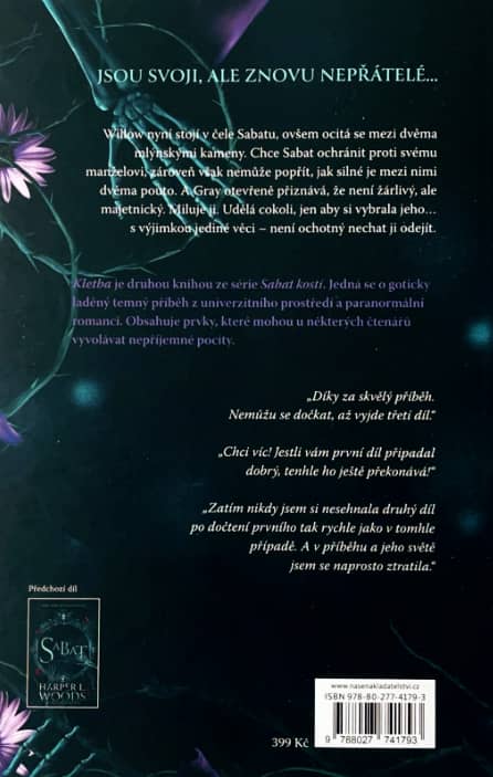 Musím se přiznat, že první díl Sabat mě úplně neoslnil, takže jsem se do Kletby pustila s lehkými obavami. A i když mezi čtením obou knih neuplynulo moc času, některé detaily mi prostě vypadly. Začátek byl proto pro mě trochu zmatený – svět, který autorka vytvořila, je dost komplexní, a bez krátkého shrnutí bylo těžké se zorientovat. Jakmile jsem se ale znovu chytila, příběh mě vtáhl víc než ten první. I když mám stále nějaké výhrady.