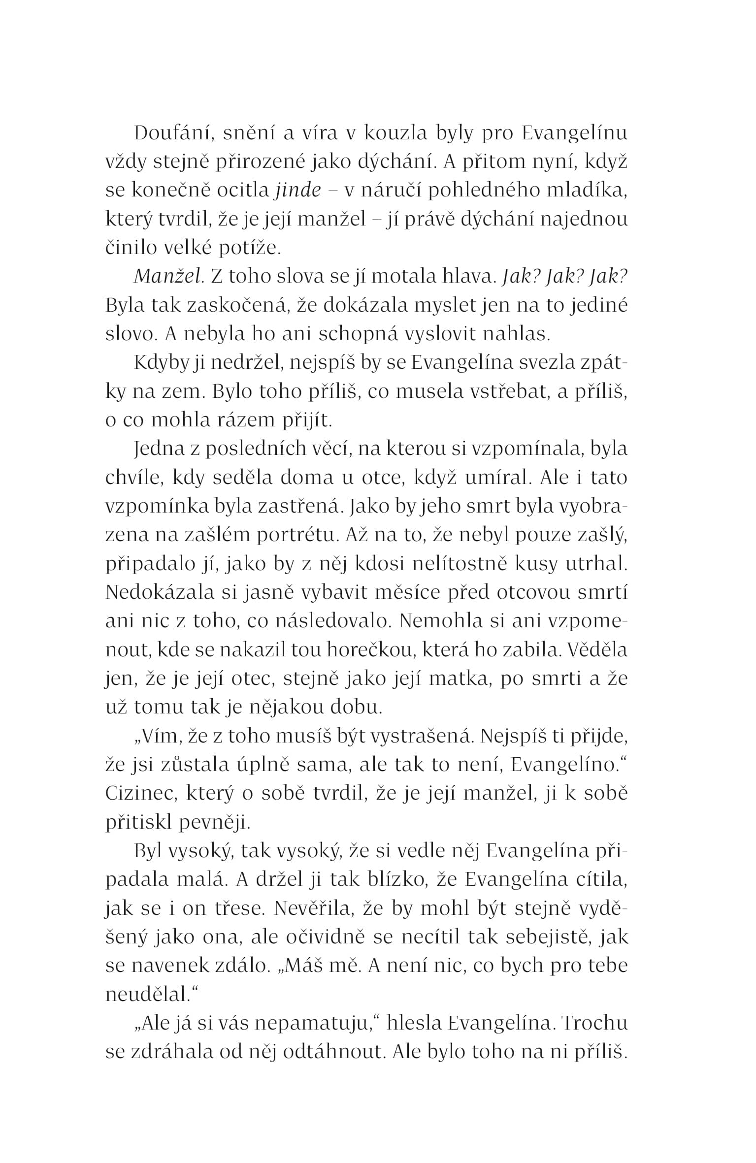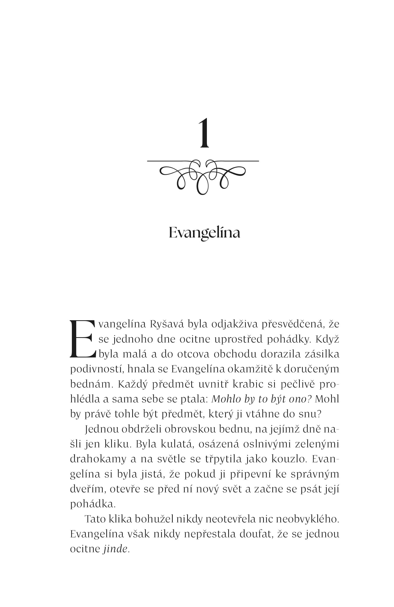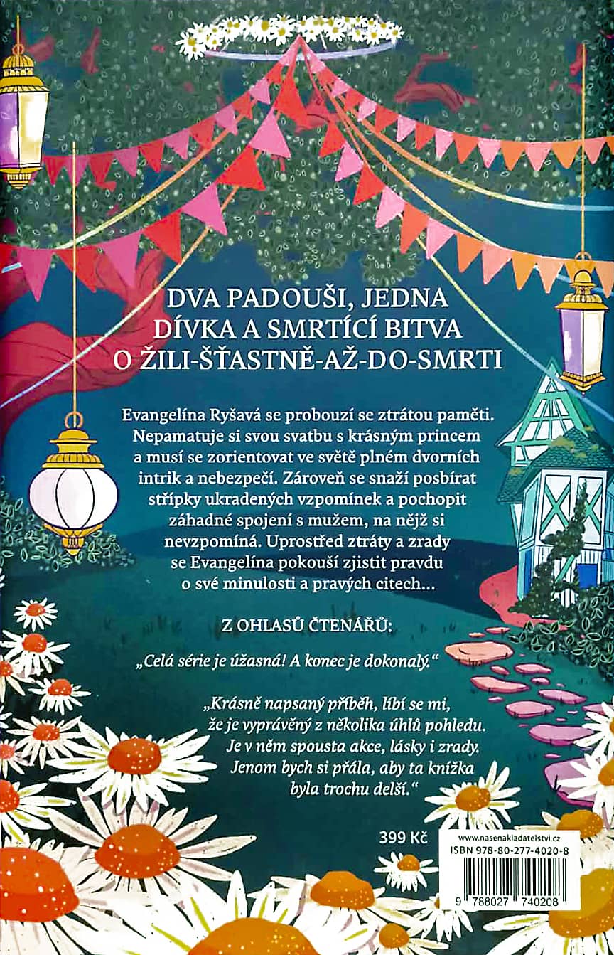 Evangelína Ryšavá byla odjakživa dívkou, která měla hlavu v oblacích. Věřila, že svět je utkán z příběhů, a že i ten její jednou dostane podobu pohádky s krásnými šaty, princem a šťastným koncem. Věřila v lásku na první pohled, v osudová setkání i v kouzla, která mohou změnit běh života. Byla to právě tato víra, jež ji zavedla až na Slovutný Sever, kde se její sny zdánlivě naplnily. Stala se princeznou, vzala si pohledného prince a žila na hradě, který vypadal jako vystřižený z nejkrásnějších příběhů. Jenže pohádky, a především ony šťastné konce, mají svou cenu. Evangelína něco ztratila. Něco tak cenného, že bez toho nedokáže být celá. Ještě neví, co to je, ale cítí prázdno a její manžel, princ, udělá vše proto, aby tato prázdnota zůstala bezejmenná.