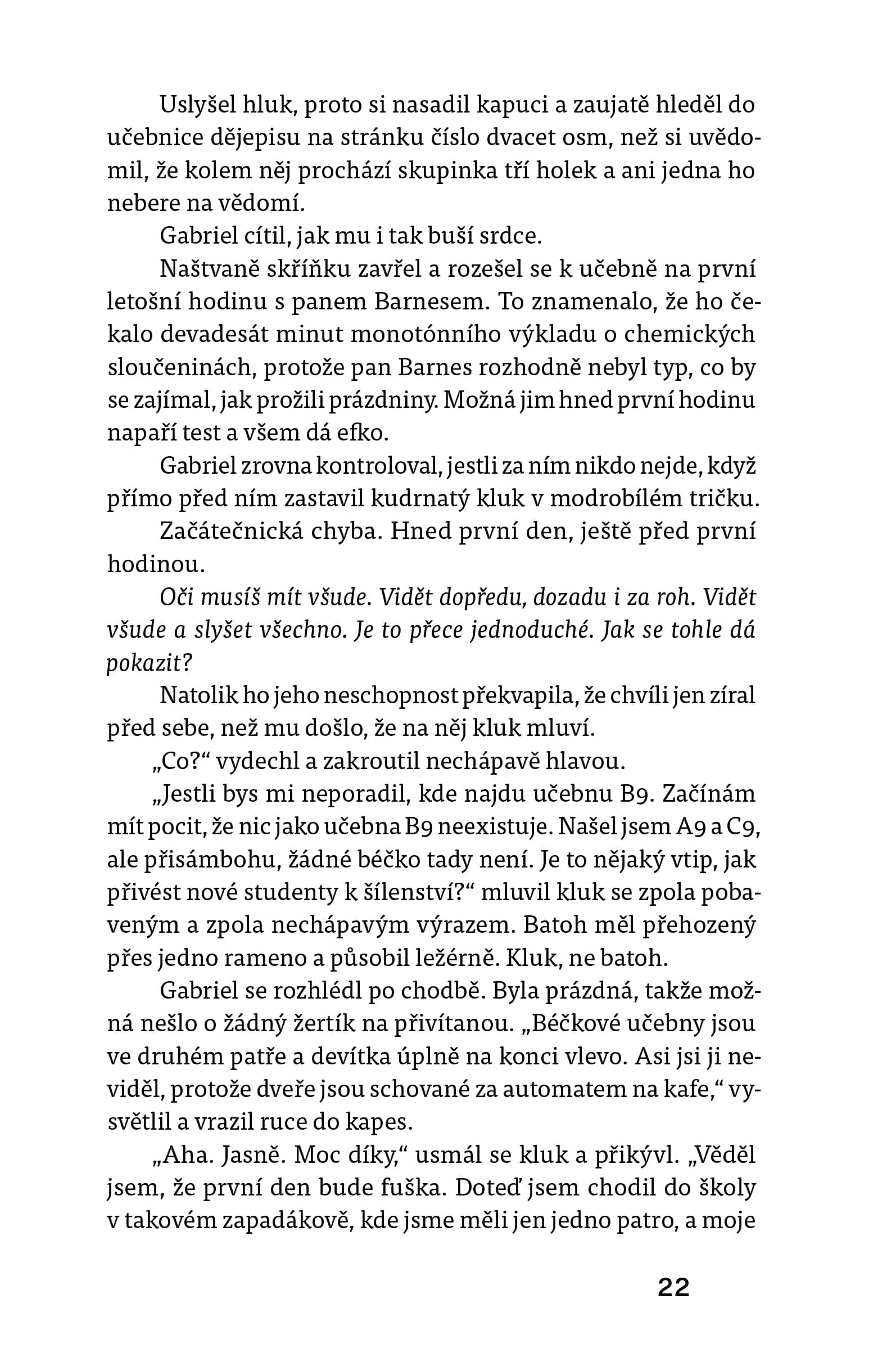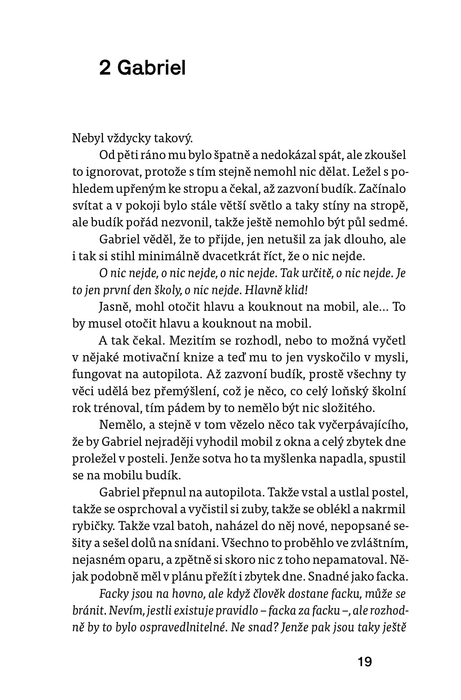 Čekala jsem, že budu svědkem coming outů, rodičovské zatrpklosti, nesouhlasných pohledů a nevím čeho všeho ještě. Ale ne, kniha jde jiným směrem. Homosexualita se tematizuje jen okrajově. Michaelova parta má například velkou legraci z toho, že je Gabriel homosexuál, ale vlastně je to pro ně méně podstatné, než že láskou hoří zrovna k Michaelovi. To je předním důvodem jejich pitomých vtipů. Rodiče o Gabrielově orientaci už dávno ví, dokonce se Gabriela doptávají, jací kluci se mu líbí. Gabrielovo okolí to tak podvědomě docela přijímá.
