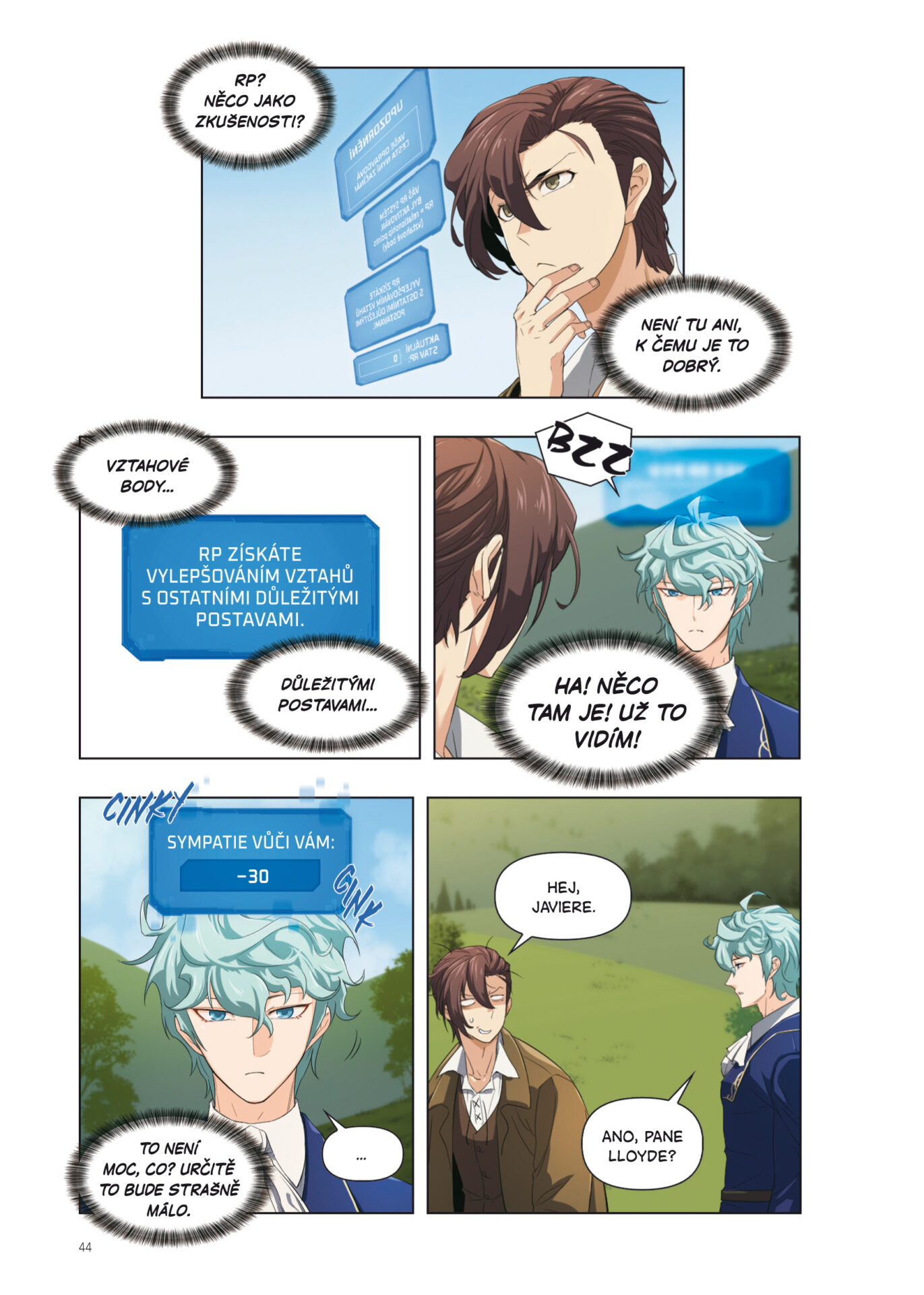 Tento titul se navíc zcela oprávněně pyšní štítkem „inspirováno hrami“ a i tento specifický prvek je zde využit s maximální autorskou grácií. Lloyd vidí okolní svět primárně přes modré herní rozhraní, které mu neustále zadává úkoly a uděluje cenné body. Jenže místo tradičních a ohraných misí typu „zabij deset krvelačných goblinů“ musí získávat tzv. RP, tedy určité body popularity u lokálních obyvatel. Sledovat, jak nadšeně a s fanatickým leskem v očích vylepšuje své dovednosti v zedničení a tesařině, je bizarně uspokojující. Systém si s ním navíc nebere žádné zbytečné servítky a často mu jeho případné neúspěchy velmi uštěpačně komentuje, což ještě více přidává na celkové komičnosti situace.