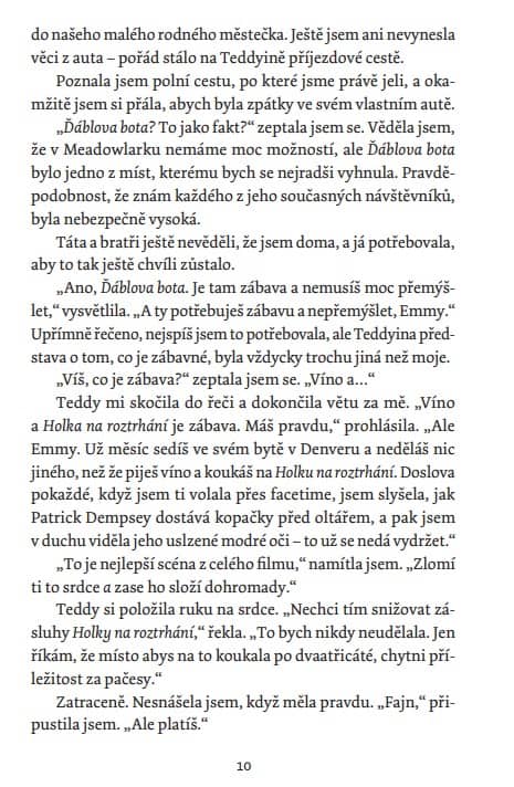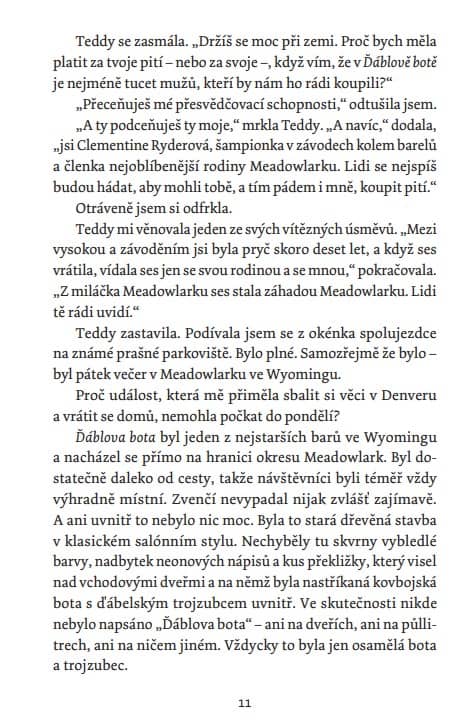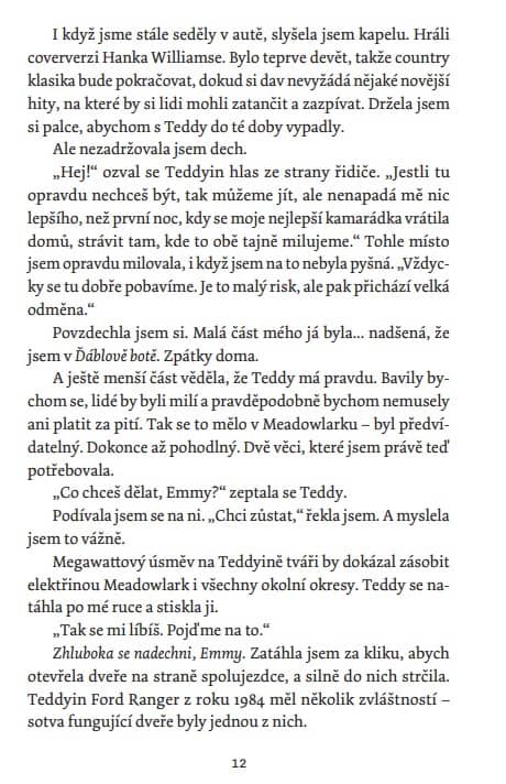 „Byla jsem pitomá, když jsem ho dnes večer nechala odejít? Tohle mohl být jeden z těch okamžiků. Takové, které se zdají být nedůležité, ale nakonec se ukážou jako podstatné. Ty, které změní směr i vaši cestu. To jsem chtěla. Novou cestu. Chtěla jsem jeho. Bez rozmyslu jsem otevřela vchodové dveře a byla připravená ho pronásledovat.“