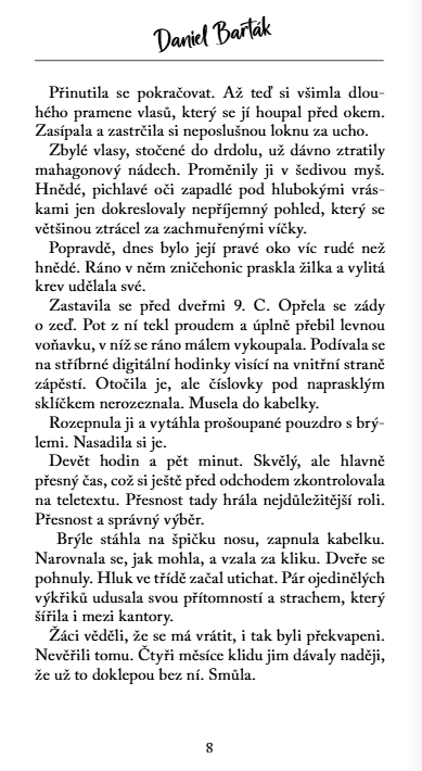 Bartákův styl je jednoduchý a plynulý. Nepotřebuje se zdržovat dlouhými popisy nebo psychologickými výlevy, spíš dává prostor situacím a náznakům. V tomto směru se kniha čte snadno a rychle, takže vás nechává v napětí bez zbytečného zdržování.
