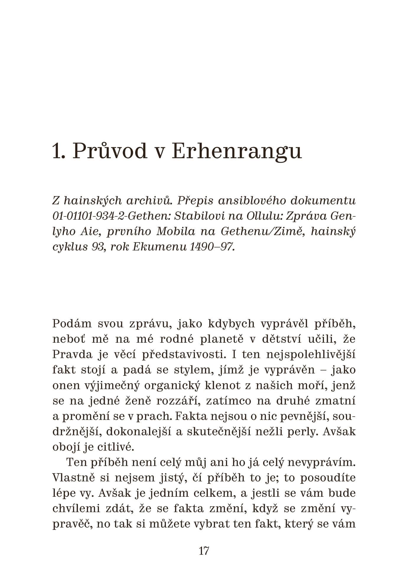 To způsobuje, že můžete být zprvu zmateni. Troufám si však tvrdit, že Levá ruka temnoty nabízí dostatečná vysvětlení pro svůj základ, který položily jiné tituly Le Guinové. Můžete se tedy poměrně v klidu soustředit na osobitost právě tohoto příběhu a stejně jako u Vyprávění razím cestu náhodného čtení, nenásleduji tedy žádnou posloupnost knih. Hodí se však říct, že Levá ruka temnoty je jedním z těch starších titulů, což možná vysvětluje, že se v ní mnohé prezentuje ještě dostatečně v rámci kontextu.