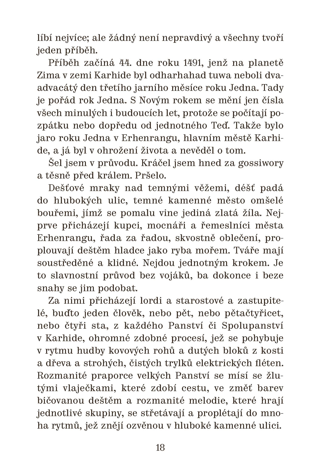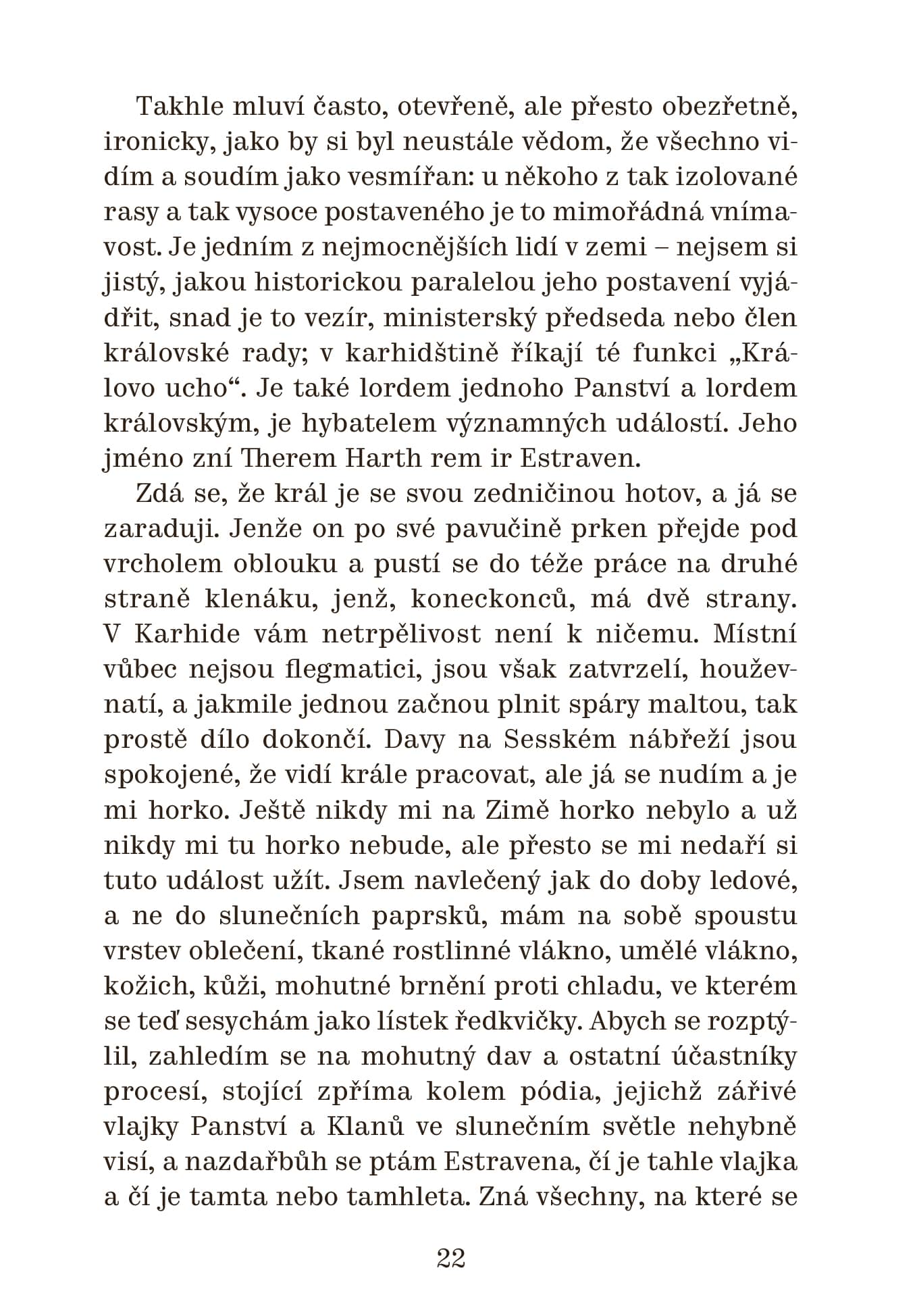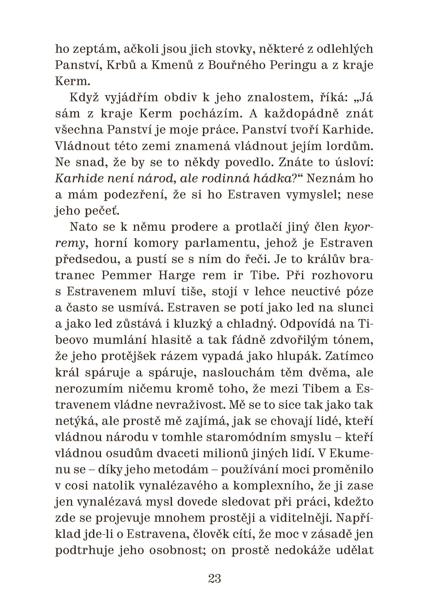 Mimo ně tu máme šíleného krále Karhide, Argavena, kupu dalších politiků, kteří se vám začnou časem plést dohromady, a pár dalších postav, které náhodně potkáme, abychom je zase opustili. To je podle mě místy škoda, mám pocit, že mnoho postav mělo potenciál nám říct více, ale šanci nedostaly.