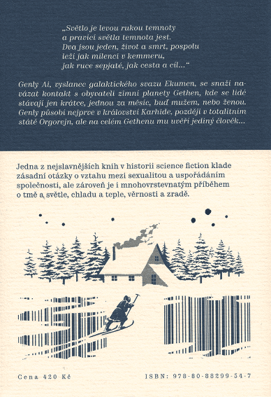 Vyvedení knihy je prosté, v brožované obálce s jednoduchou, byť výmluvnou ilustrací. Jak už bylo řečeno, obálka obsahuje i doplňky, které vám pomohou se v příběhu lépe orientovat. I překlad v podání Jakuba Němečka je, myslím, zdařilý. Nabízí se však nutně otázka, jak se vlastně s textem pracuje, když nemáme rodové preference. Zdá se ale, že to vám vysvětlí sama kniha, ve které se výzkumníci na Zimě shodují na tom, že používat generické maskulinum je nejvýhodnější. I ta jména znějí dost mužsky, že? To však pojďme nevyčítat knize, která vyšla poprvé v roce 1969 a která v té době načala docela kontroverzní téma sama o sobě. A už vůbec nemůžeme hledat chybu v překladu. Pozornost těmto nedostatkům věnuje i doslov, který navíc hezky shrnuje i dobový kontext. Jen zkrátka musím poznamenat, že bylo těžké postavy nevnímat jako muže, kteří se prostě jednou za čas stanou ženami.