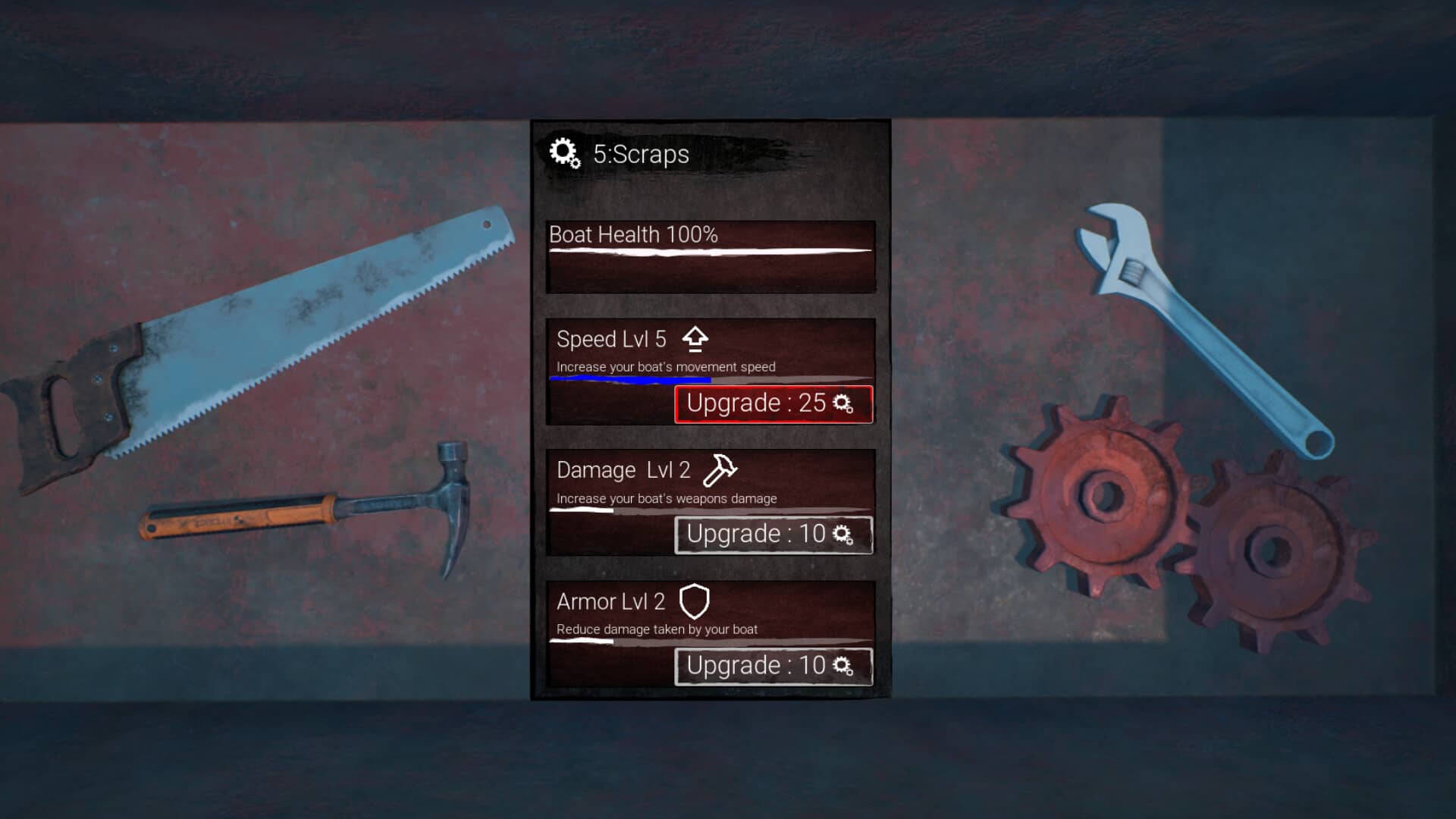 K vylepšení lodi budete sbírat šrot (scraps) při prozkoumávání ostrova nebo plněním misí. Vaše loď je vaše záchranné lano a je životně důležitá pro vaše přežití. Takže ji musíte udržovat silnou a neustále ji vylepšovat. Situaci navíc komplikuje skutečnost, že jiní se již pokusili z ostrova uniknout, a výsledky těchto neúspěšných pokusů je zanechaly poněkud nepřátelské a nebezpečné.
