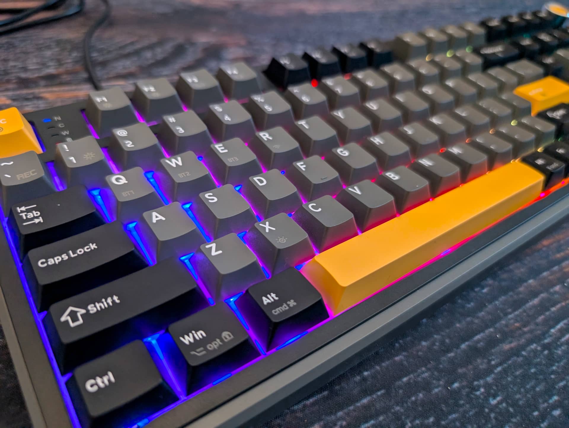 Nevyhovuje-li vám kabel, nezoufejte. Na okraji klávesnice najdete malý přepínač, díky kterému můžete klávesnici s počítačem propojit přes Bluetooth nebo 2,4G. Obě bezdrátové formy připojení fungují naprosto skvěle a zajišťují spolehlivý a rychlý přenos i při rychlém psaní nebo hraní. Dongle pro 2,4G je navíc důmyslně ukrytý přímo v těle klávesnice hned vedle přepínacího tlačítka a už nikdy se vám tak nestane, že byste jej nemohli najít. Leda byste ho zapomněli v nějakém nepoužívaném zařízení. Dosah bezdrátového připojení je až 10 m, a klidně si tak klávesnici můžete vzít s sebou do postele, zatímco na počítači sjíždíte seriály. Díky 4000mAh baterii navíc vydrží opravdu velmi dlouho, než ji budete muset znovu nabíjet.
