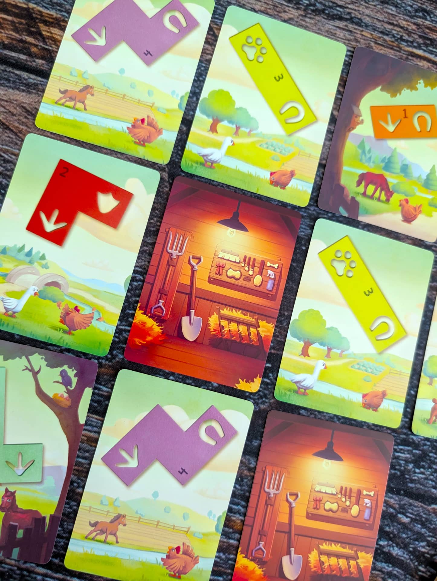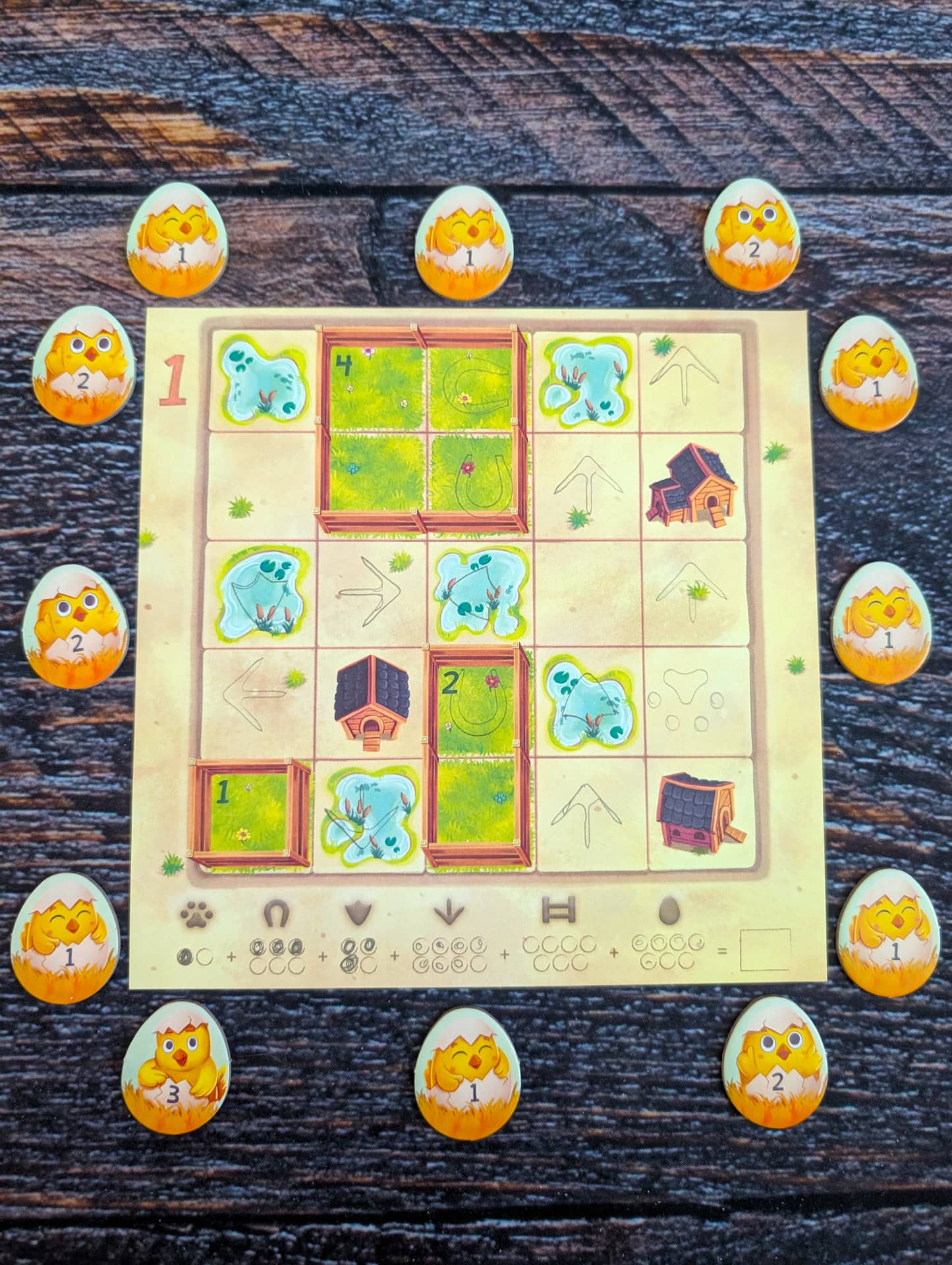 Za co budete bodovat? Za uspokojení potřeb vašich zvířátek. Dvorek totiž není jen prázdnou mřížkou, do níž si dle libosti čmrkáte. Obsahuje výběhy, kurníky, rybníky a volnou půdu. Koníci vám dají body, pokud jsou ve výběhu. Slepičky ocení, když jsou ortogonálně vedle kurníku. Kačenky chtějí samozřejmě plavat na rybníčku a pejsci si rádi hrabají v hlíně.